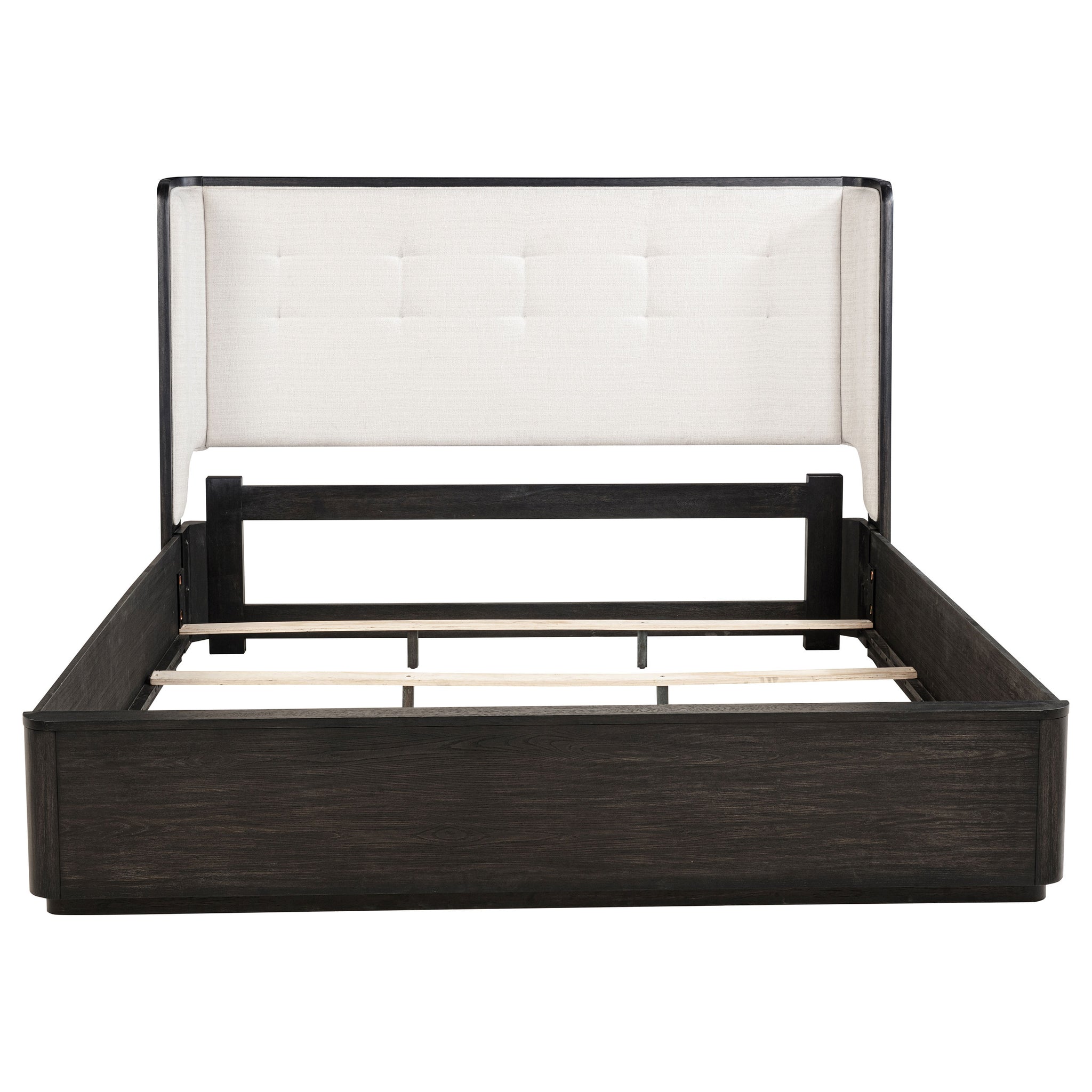 Embrace restful refinement with this wingback bed, where sculpted edges and tailored softness unite. The headboard’s clean winged silhouette is wrapped in cream fabric, offering contrast against the burnished black frame and subtle tufting for a gentle finish. Crafted from a blend of solid and engineered wood, this foundation-ready bed balances strength with serenity, blending modern minimalism with quiet luxury. Key Features: • Queen wingback bed with soft curves and burnished black frame for modern sculptural style • Cream upholstered headboard adds tailored softness with subtle tufting • Contrasting textures highlight the clean silhouette and restful form • Foundation-ready platform design accommodates standard mattress setups • Crafted from ash veneer, solid wood, engineered wood, and supportive plywood • Neutral palette and gentle proportions create a serene bedroom focal point