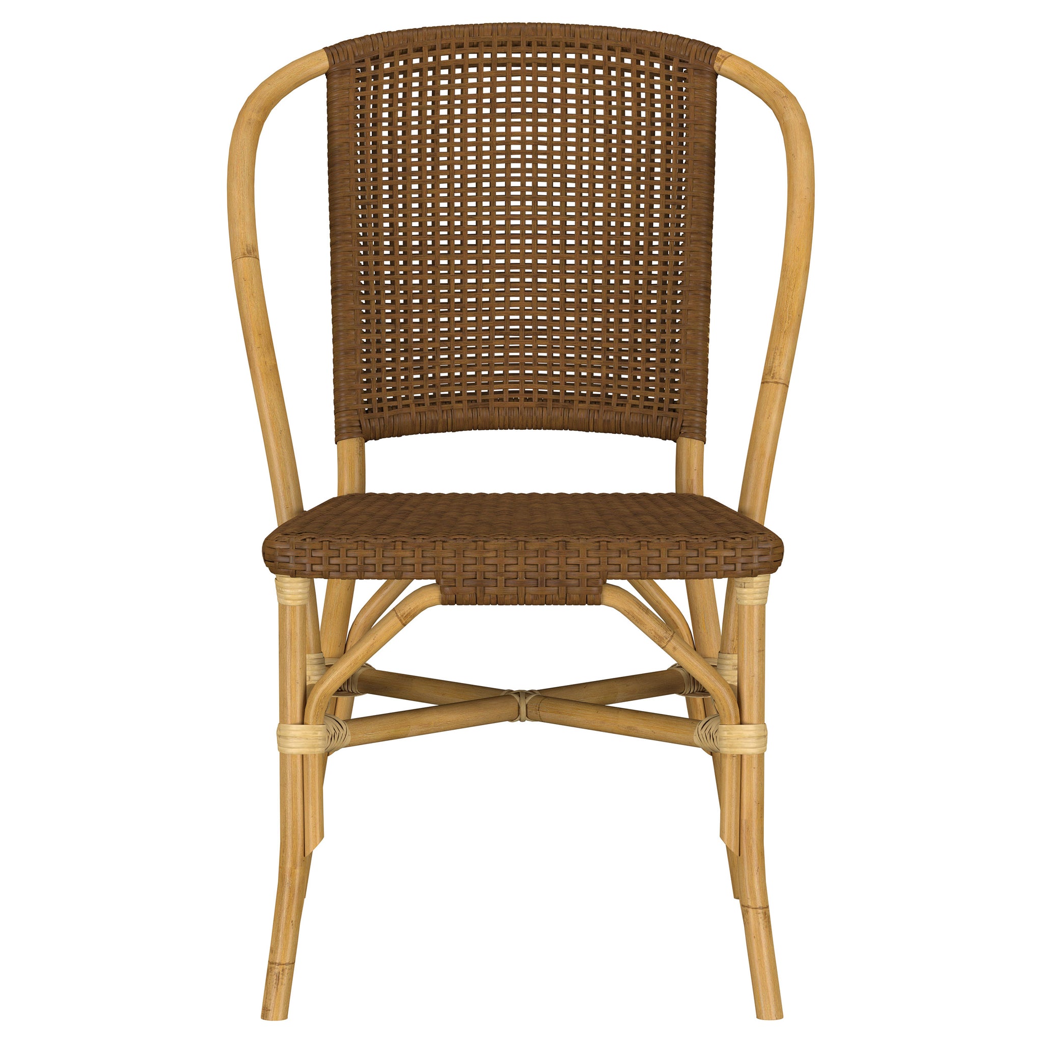 Natural texture and timeless craftsmanship come together in this artisan-inspired side chair. A gently curved rattan frame offers organic beauty and lightweight strength, while woven rattan webbing across the seat and back adds dimension and breathability. Finished in a warm brown tone that highlights each handcrafted detail, this chair brings a relaxed, sun-washed elegance to dining spaces, patios, or casual indoor settings. Key Features: • Side chair features a handcrafted rattan frame with woven seat and back detailing • Curved backrest and rounded edges create a soft, welcoming silhouette • Woven rattan webbing adds breathable comfort and artisanal texture • Natural brown finish enhances the grain and tone of the rattan throughout • Lightweight yet sturdy design is ideal for flexible or casual seating arrangements • Perfect for coastal, tropical, or laid-back transitional dining environments