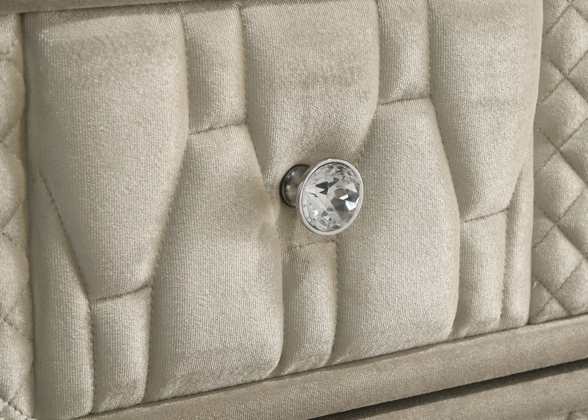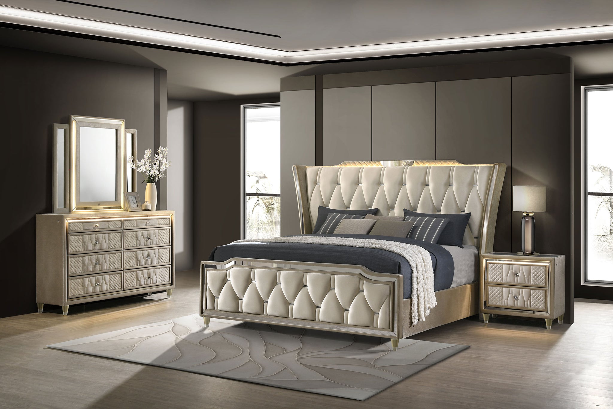 Unite form and function in this bedroom set, where sculpted glamour meets modern refinement. Each piece is wrapped in ivory and camel velvet with quilted textures, crystal knobs, and reflective acrylic accents. The dresser features a clear tempered glass top and LED case lighting without the fireplace insert. Combined with the LED wingback bed, USB nightstand, and tri-panel mirror, the set delivers soft sophistication with everyday practicality. Key Features: • Bedroom set upholstered in ivory and camel velvet with quilted fronts and soft sheen • LED-lit wingback bed with tufted crown and sculpted sides creates a dramatic focal point • Dresser features eight drawers, LED trim, and a clear tempered glass top surface • Nightstand includes dual USB ports with USB-A and USB-C for smart device charging • Mirror includes tri-panel design with built-in LED light for bright, flattering view • Solid rubberwood legs, crystal knobs, dovetail drawers, and heavy-duty glides enhance durability