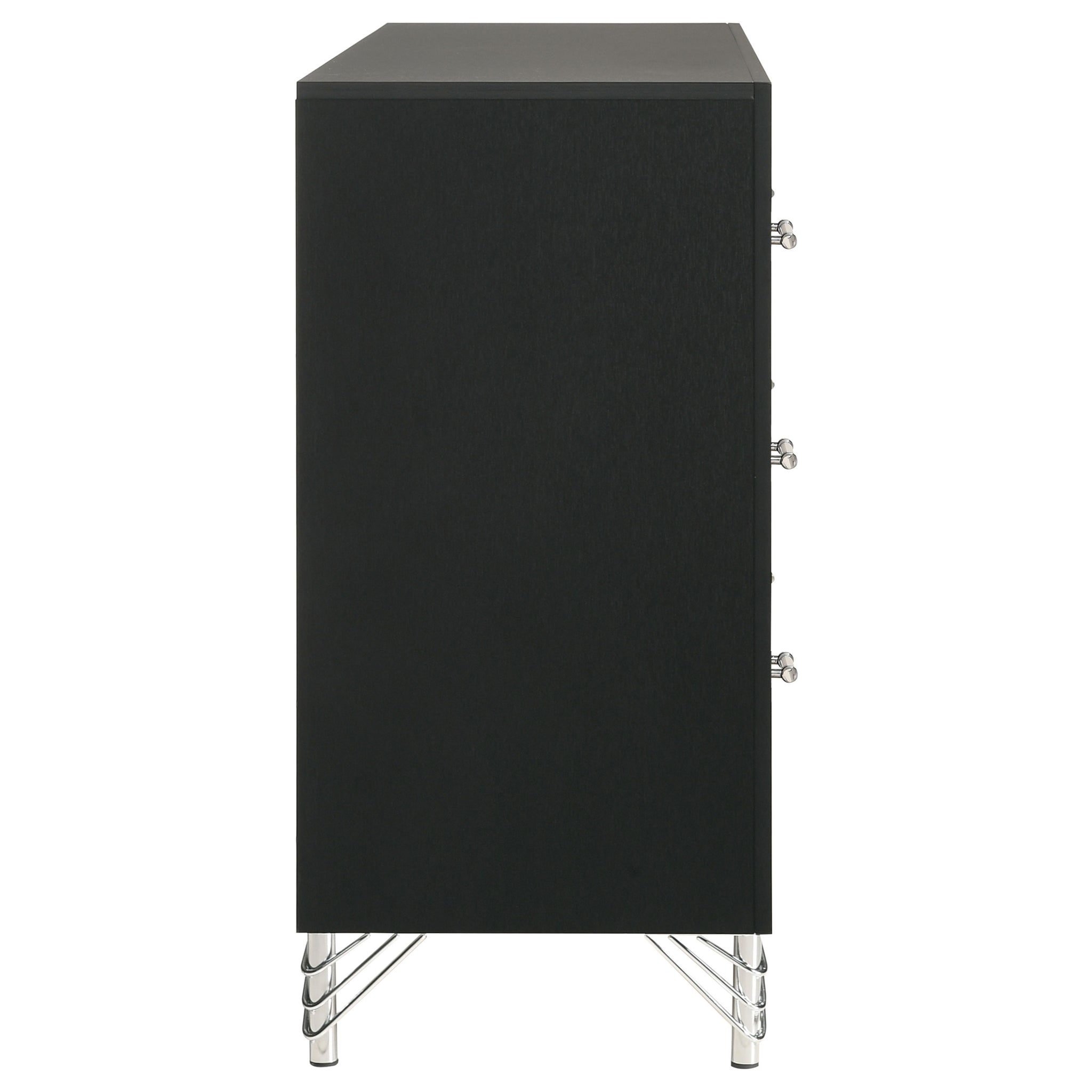 Accentuate surrounding decor with the sophistication of a modern six-drawer dresser. Designed for ample storage, it features a refined look with spacious drawers ideal for everything from clothing to accessories and linens. Its bright white finish is crisp and chic, complemented perfectly with rich, warm gold trim that gleams in the light. Decorative legs have hairpin inspired style, offering a stylish touch of vintage energy. Long bar pulls complete the look with polished perfection.