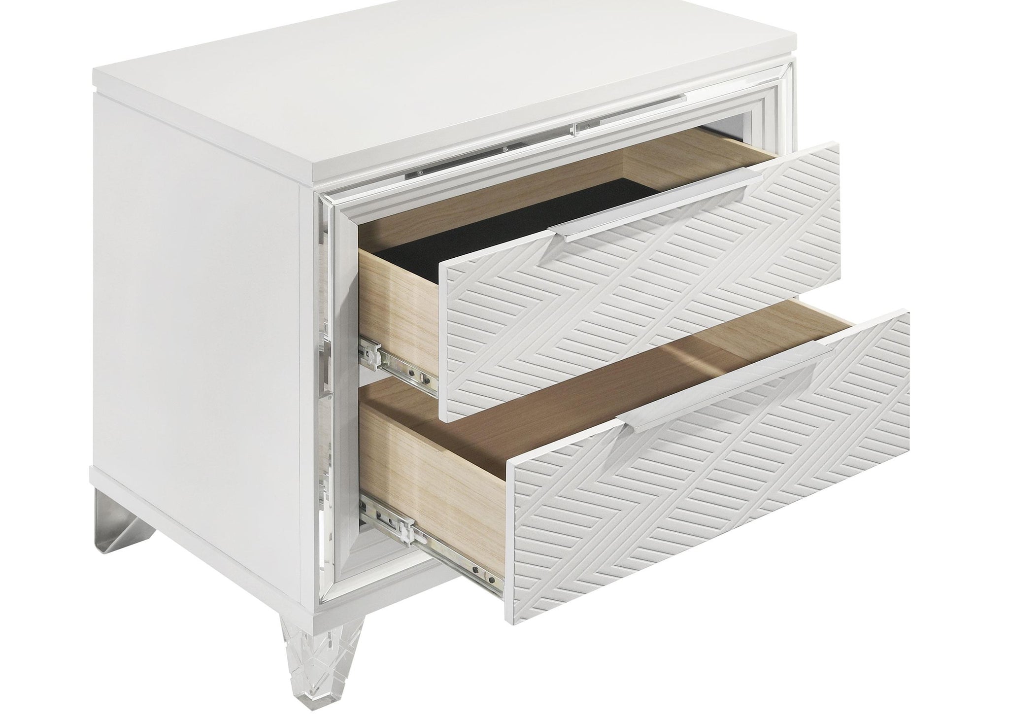Complete your bedroom ensemble with this elegant 2-drawer nightstand, designed with a modern Italian aesthetic. The white finish, accented with mirror framing and polished chrome metal hardware, creates a striking look. Featuring picture framed recessed panels with an embossed herringbone graphic pattern, this nightstand offers both style and functionality. The top drawer includes cord management access, making it perfect for your rechargeable devices. Crafted from rubberwood, MDF, and mirror, this nightstand is a luxurious addition to any bedroom. Key Features: • 2-Drawer modern Italian design with a striking white finish • Picture framed recessed panels with embossed herringbone graphic patterns • Mirror framing and polished chrome metal hardware • Top drawer includes cord management access • Crafted from rubberwood, MDF, and mirror