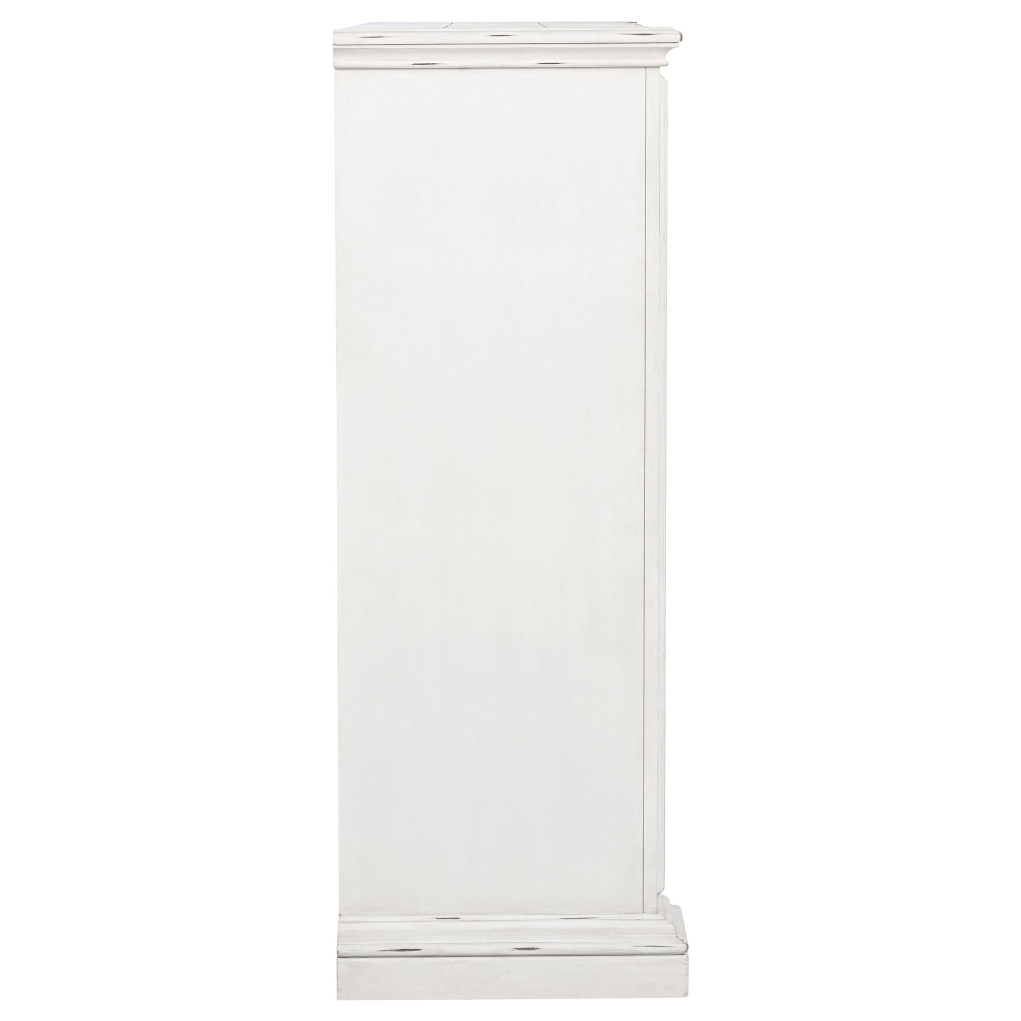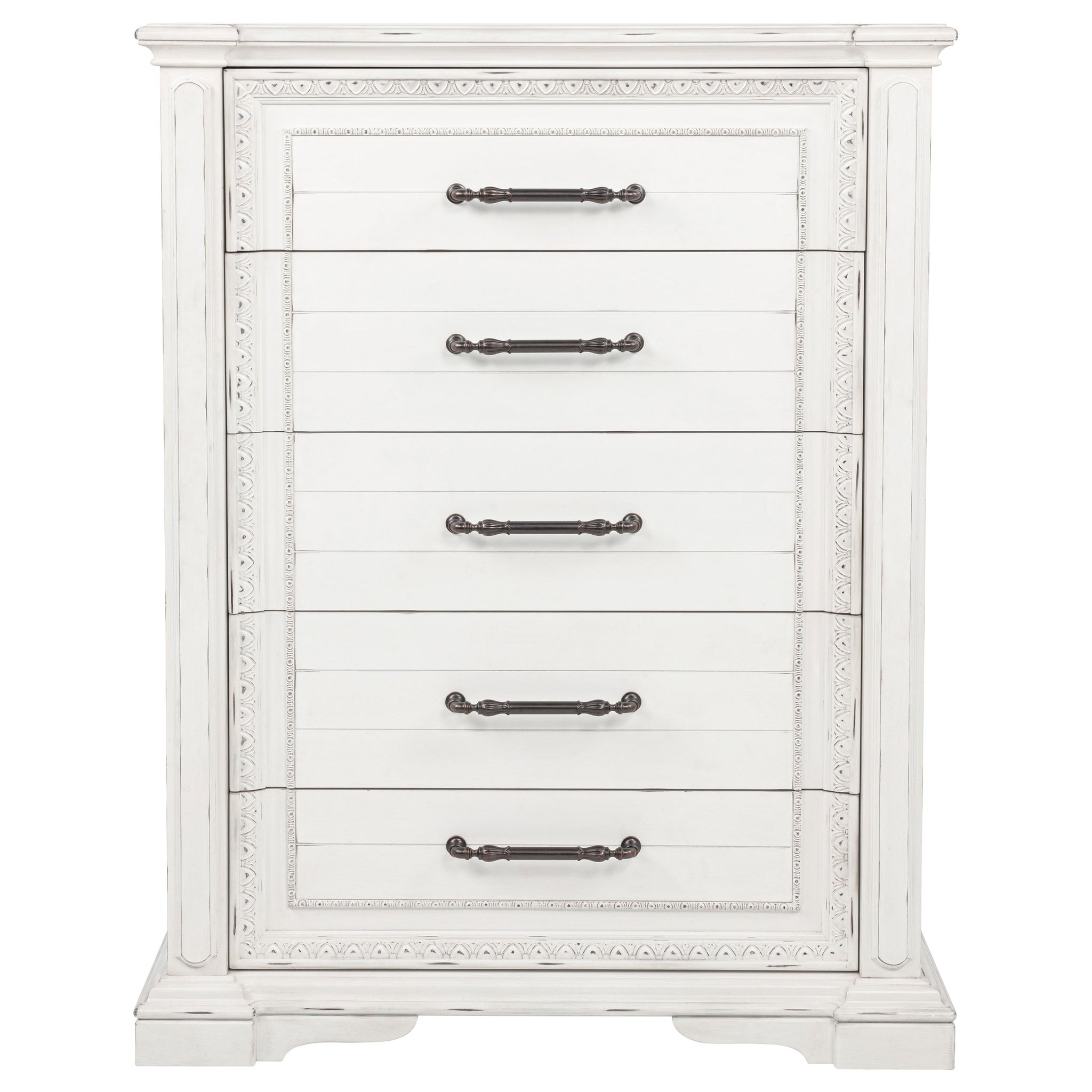 Timeless in spirit and refined in detail, this five-drawer chest evokes quiet charm and lasting beauty. A vintage white finish softens its stately frame, while molded edges and antique bronze ring pulls add character and depth. Designed with thoughtful craftsmanship, it offers spacious storage and smooth functionality. Built from poplar, engineered wood, and veneer, it brings elegance and purpose to the bedroom. Key Features: • Five-drawer chest with classic molding and clean lines for graceful bedroom storage • Vintage white finish offers a soft, aged look with traditional character • Antique bronze ring pulls add warmth and contrast to the light wood tone • Spacious drawers glide smoothly and are crafted with thoughtful construction • Top drawer is felt lined to protect delicate accessories and essentials • Built from poplar, engineered wood, and veneer for enduring style and strength