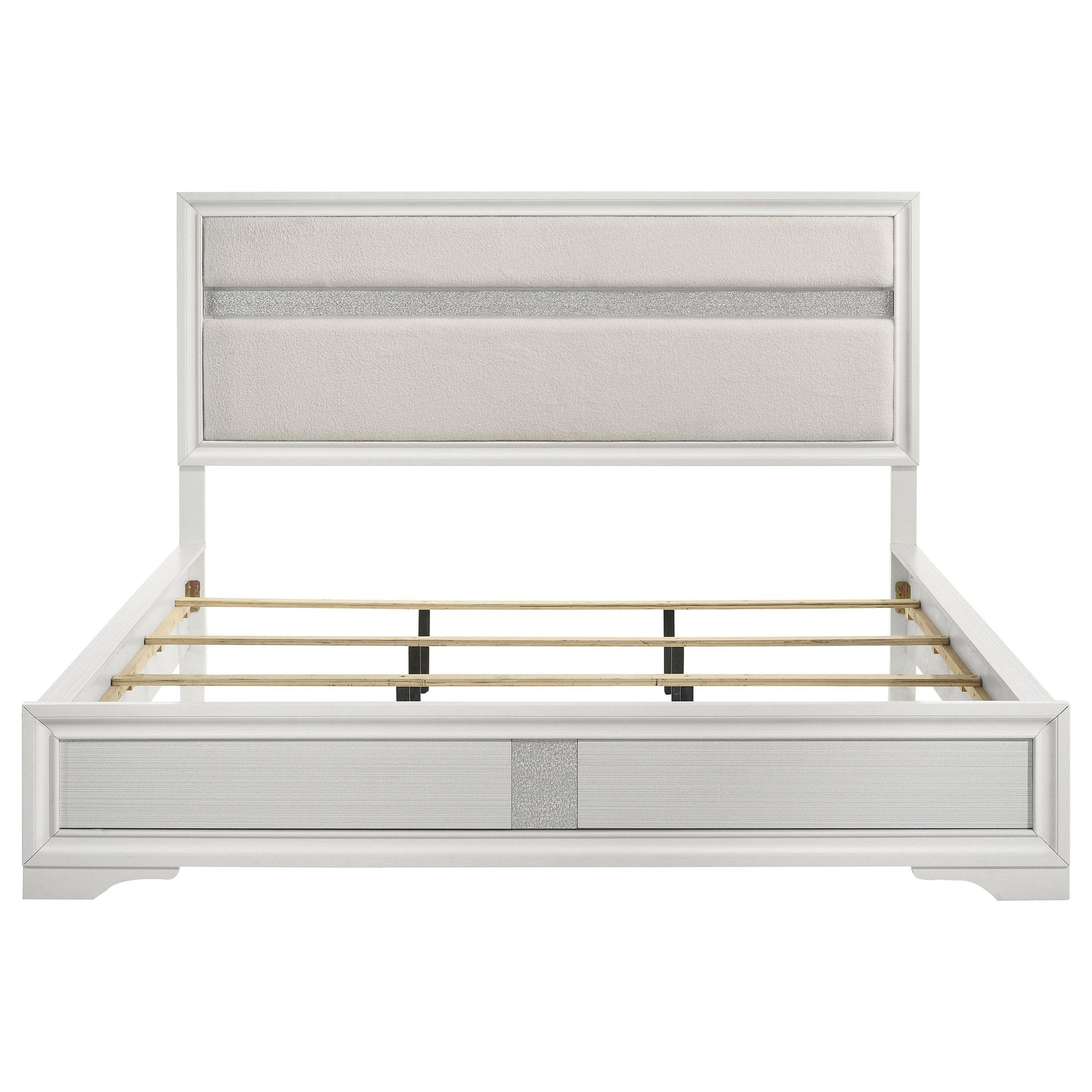 Embrace tuxedo style with the dramatic black and sparkling trim featured on a modern wooden bed. Its simple silhouette brings elegant presence with a rectangular headboard complete with upholstered panels, foam cushioning and black fabric. Glittering trim adds sparkle and elegance in a horizontal stripe on the headboard and vertical stripe on the footboard. The footboard adds a low profile, clean-lined touch, perfect for an open, airy bedroom. Thick side rails and bracket feet complete the bed to perfection.