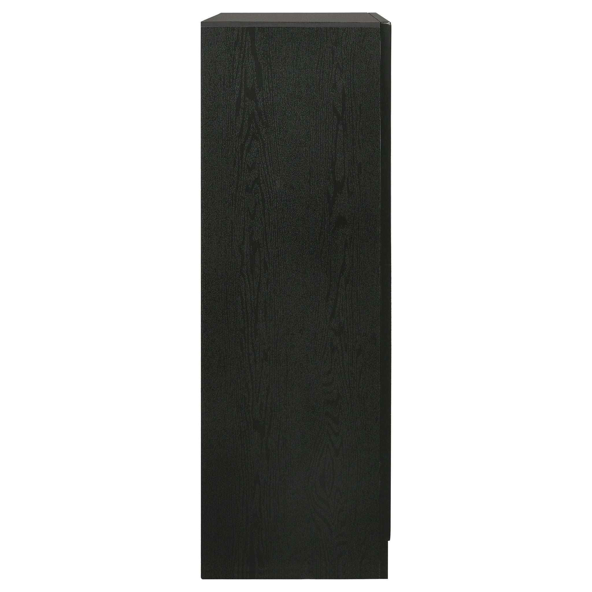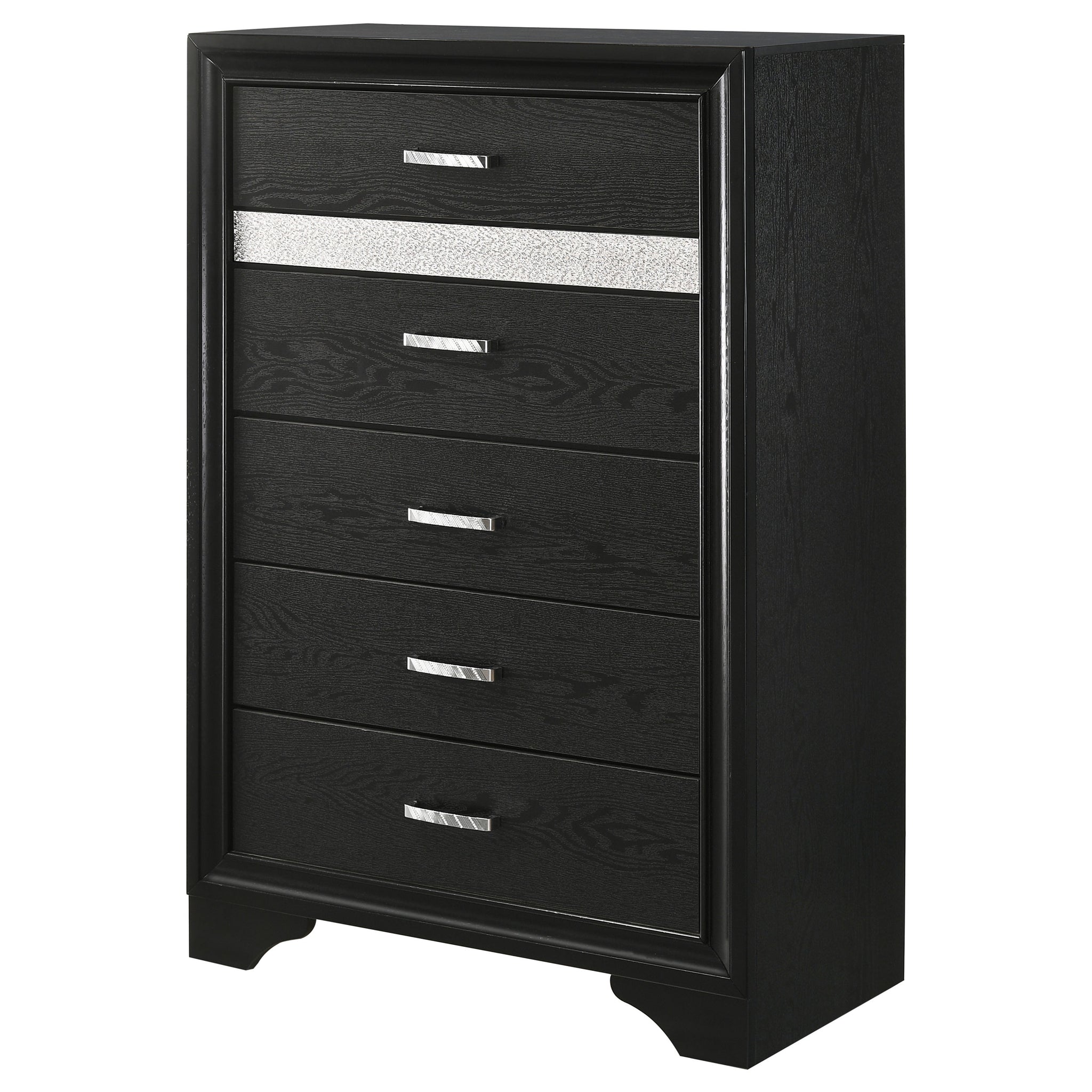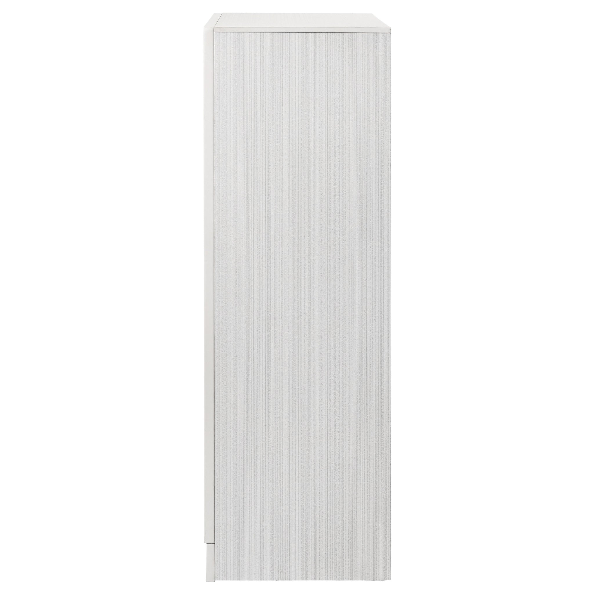 Add posh, upscale ambiance to your bedroom decor. This chic, stylish chest livens up a room with a dazzling touch of sparkle. With a hidden jewelry drawer built in, it keeps valuable items safe and secure. Its drawers are lined with felt for a luxurious hint of softness. Its six convenient drawers are built with metal extension glides for versatile ease of use. Key Features: • Six spacious drawers offer practical vertical storage • Hidden felt-lined drawer concealed behind glitter accent • Crystal drawer pulls bring added shimmer and texture • White finish with subtle side panel texture • Metal-extension drawer glides for everyday ease • Engineered wood frame with laminate veneer surfaces