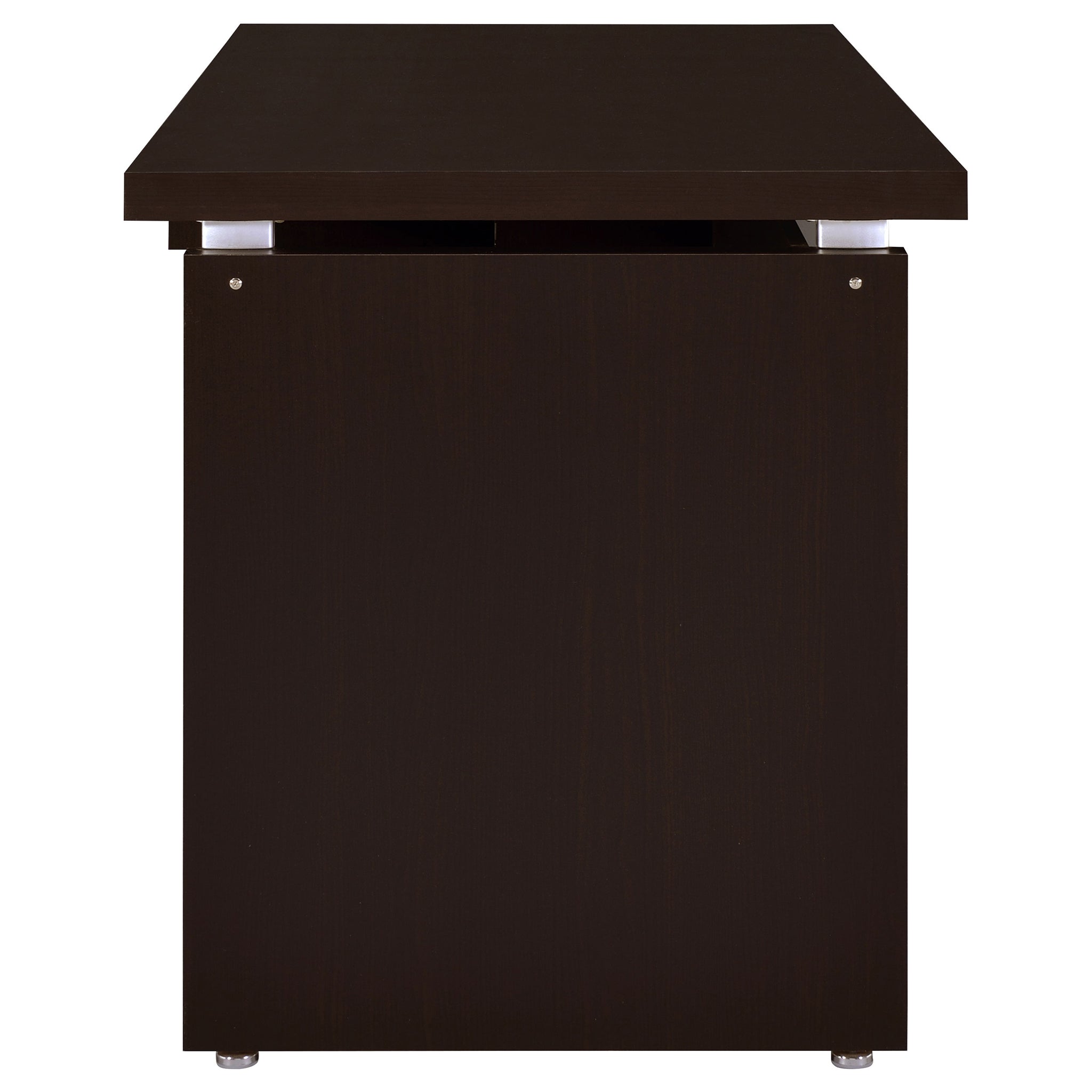 This modern computer desk blends sleek design with practical features for a sophisticated workspace. Constructed from durable engineered wood with a wood-look laminate veneer, it offers both style and functionality. The floating top design adds a contemporary flair, while the keyboard tray provides easy access to essential devices and accessories. Finished in a rich, versatile tone, this desk is perfect for home offices, providing a clean and minimalistic aesthetic with ample work space for your computer, documents, and more. Key Features: • Sleek computer desk with a contemporary floating top design for modern style • Built from engineered wood with a wood-look laminate veneer in a cappuccino finish • Features a convenient pull-out keyboard tray for easy access to your devices • Offers ample workspace for computers, documents, and office supplies • Simple, clean lines make it ideal for both home and office environments • Sturdy construction ensures lasting durability and stability for daily use