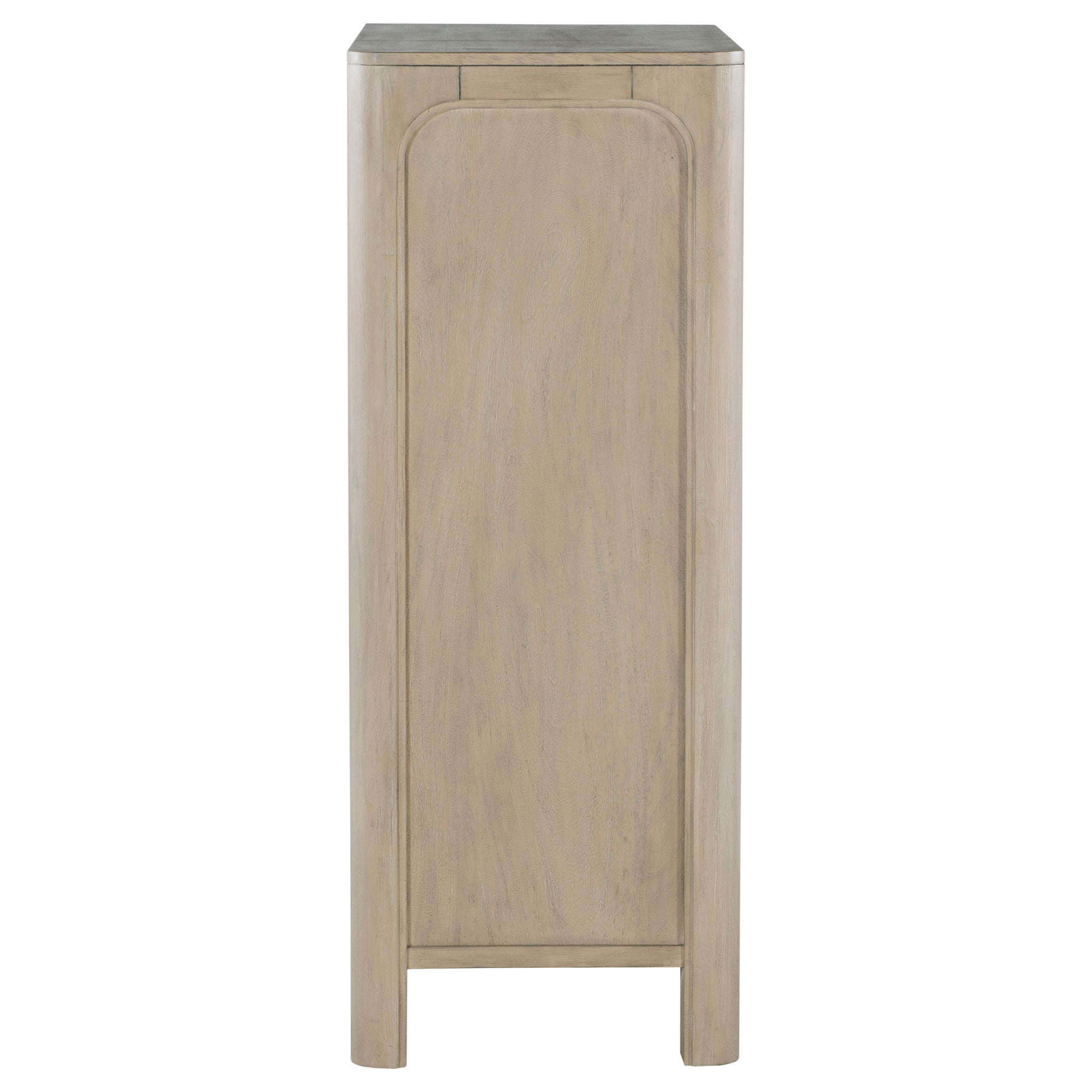 Gracefully composed with rounded edges and sculptural form, this five-drawer chest evokes a quiet sophistication. Its tall silhouette offers a sense of order, while sculpted corners and subtle detailing bring soft elegance to the bedroom. A felt-lined top drawer and hidden compartment add thoughtful layers of function. Crafted with care and presence, it offers both beauty and intrigue in equal measure. Key Features: • Five-drawer chest with sculpted corners and softened lines for elegant bedroom storage • Weathered mango finish enhances natural grain with a relaxed, organic texture • Felt-lined top drawer offers gentle protection for jewelry, watches, or accessories • Secret nested drawer in second drawer from top provides discreet storage • Heavy duty drawer glides ensure smooth, lasting drawer operation • Crafted from mahogany, engineered wood, and mango veneer for strength and style