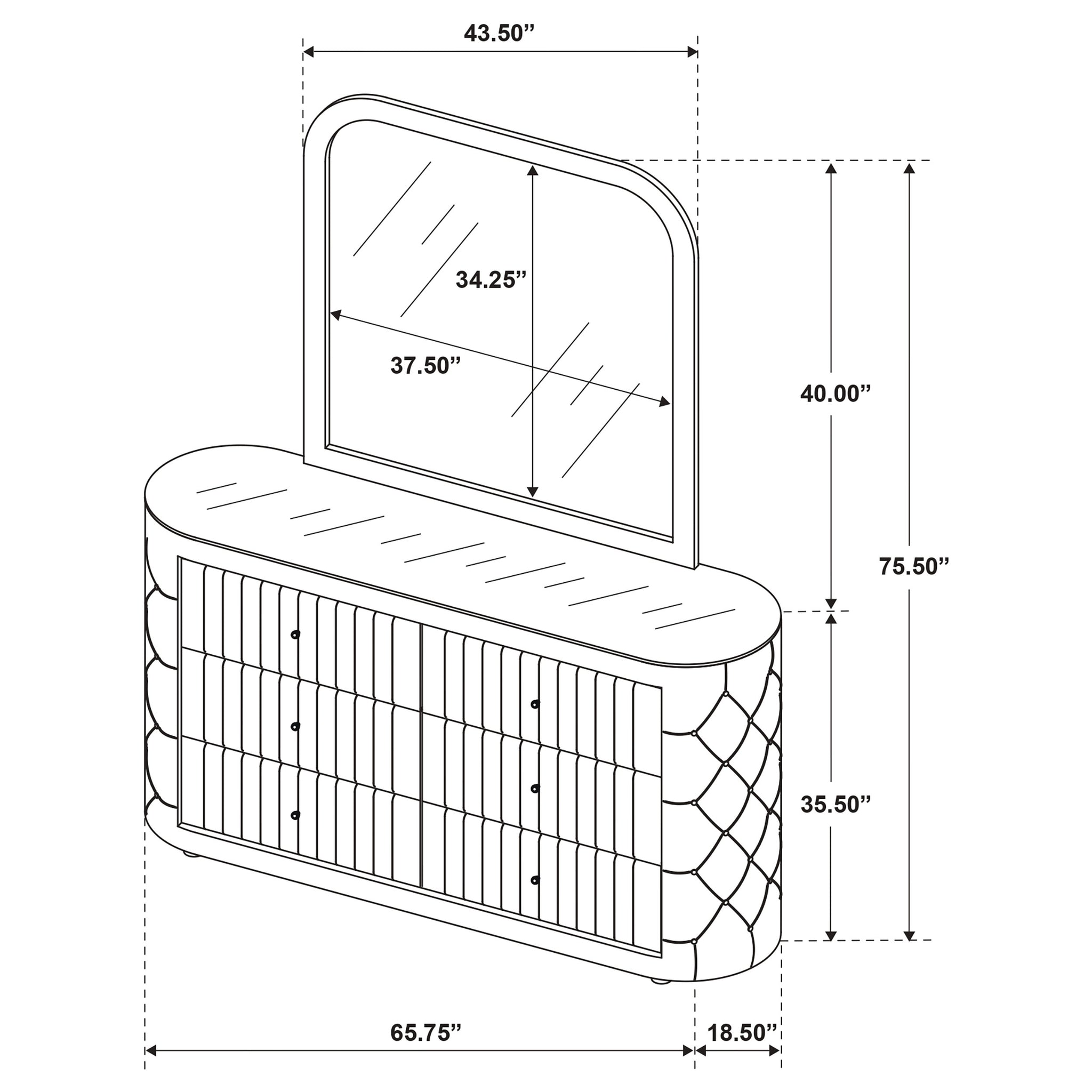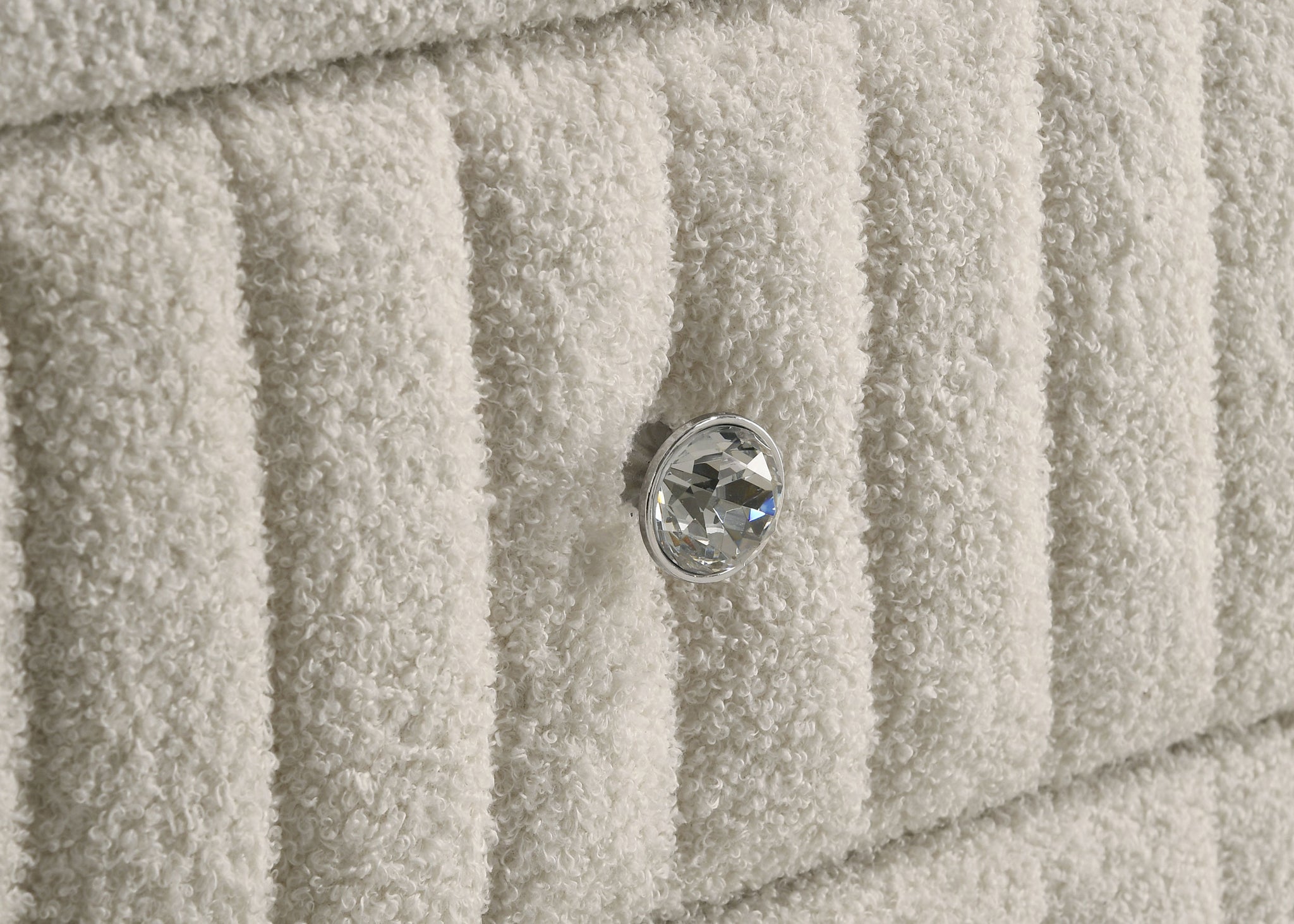 Wrapped in a cloud of boucle and gleaming detail, this dresser and mirror set transforms any bedroom into a personal sanctuary. Diamond tufting along the sides sparkles with embedded crystal accents, while vertical channeling on each drawer adds tailored rhythm and depth. Topped with a sleek mirror framed in matching fabric, the design offers a romantic balance of softness and structure, inviting both elegance and indulgence into everyday routines. Key Features: • Dresser and mirror set features plush boucle upholstery in a soft ivory tone throughout • Six drawers with vertical channeling offer bedroom storage and refined visual texture • Diamond-tufted sides embellished with crystal-style accents elevate the glam appeal • Clear tempered glass top offers a smooth, durable surface that enhances the look • Framed mirror matches the upholstered silhouette for a cohesive bedroom presentation • Crafted from solid rubberwood, engineered wood, boucle fabric, and foam for longevity