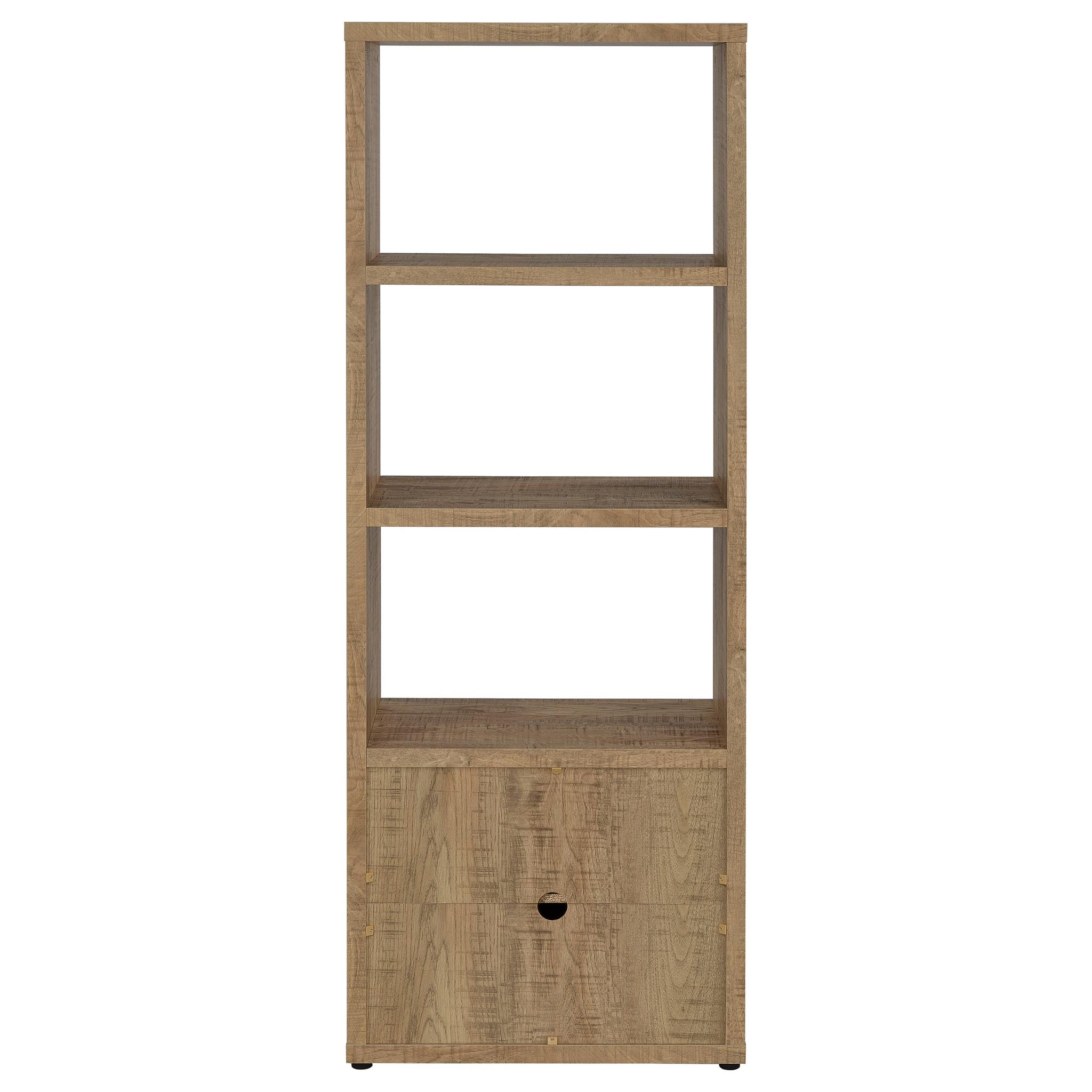 The best of both worlds, a charming media tower bookcase adds both open display space and hidden storage in your inviting living room. Featuring a melamine paper finish that resembles mango wood, complete with roughhewn saw marks for a realistic, textured presentation, the tower is a perfect choice alone or flanking the matching TV stand. Three upper shelves provide a place for photos and art and glasswork, or can be used to display favorite media. Underneath, a two-door cabinet reveals additional shelving for easy organization of accessories and other odds and ends you'd prefer tucked out of sight. Sleek black pull handles are a perfect finishing touch. Key Features: • Charming media tower bookcase adds open display and hidden storage • Melamine paper finish resembles mango wood with roughhewn saw marks • Three upper shelves for photos, art, and glasswork • Two-door cabinet with additional shelving for accessories and odds and ends • Sleek black pull handles for a perfect finishing touch