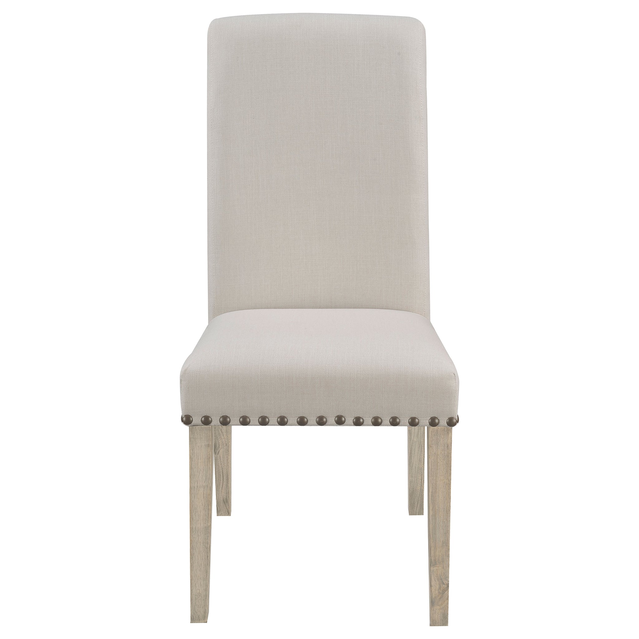 Appreciate the sophisticated look of a tall silhouette with fresh, inspiring style. This dining chair offers a versatile look that blends well with glass, wood, or metal tables. Transitional in motif, it combines invigorating modern touches with classic elements. A neutral upholstered wrap generates light, airy ambiance. Charming nail heads line the bottom of its seat edge, and narrow tapered legs with a neutral finish balance a stylish palette. Key Features: • Tall silhouette with fresh, inspiring style perfect for glass, wood, or metal tables • Transitional motif combining modern touches with classic elements • Neutral upholstered wrap creates light, airy ambiance • Charming nail heads line bottom of seat edge • Narrow tapered legs with neutral finish balance stylish palette