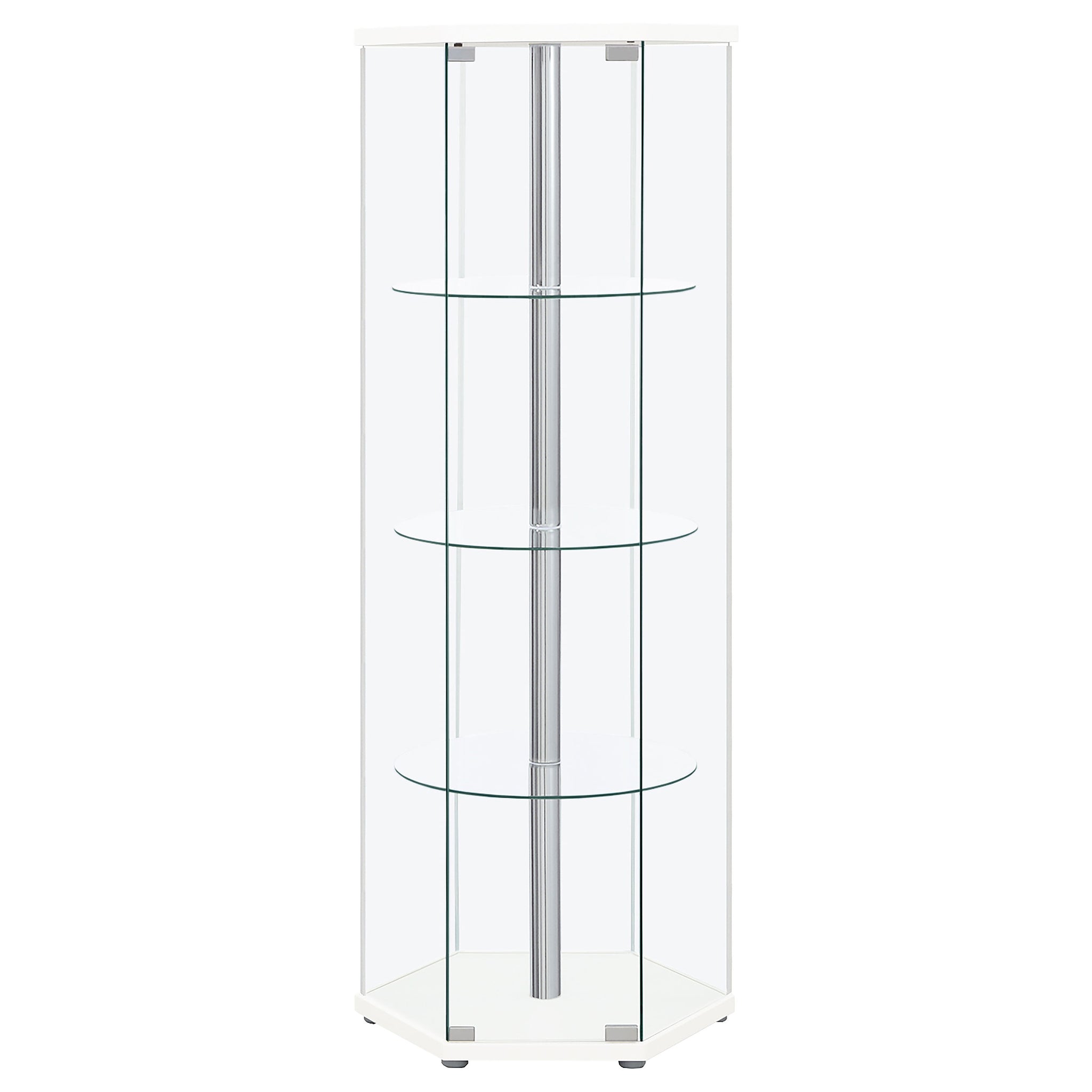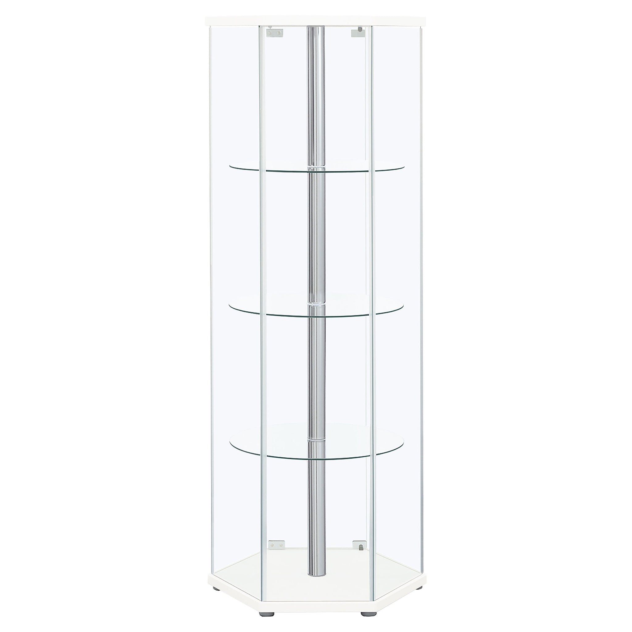 This curio cabinet reimagines display storage with a striking hexagonal silhouette. Its geometric shape adds visual depth while clear tempered glass panels showcase treasured items from all angles. Three round glass shelves offer generous space for décor, collectibles, or keepsakes, supported by a sleek center pole with chrome accents. With a magnetic push-to-open door and sturdy construction of glass, engineered wood, and laminate veneer, this piece is a stylish way to highlight what matters most. Key Features: • Hexagonal curio cabinet in black with sleek chrome accents and center pole • Magnetic push-to-open clear tempered glass door provides easy access • Three round tempered glass shelves for collectibles and decorative items • Clear tempered glass panels highlight displays from multiple viewpoints • Constructed with glass, engineered wood, laminate veneer, and metal • Geometric design creates a striking modern presentation for display pieces