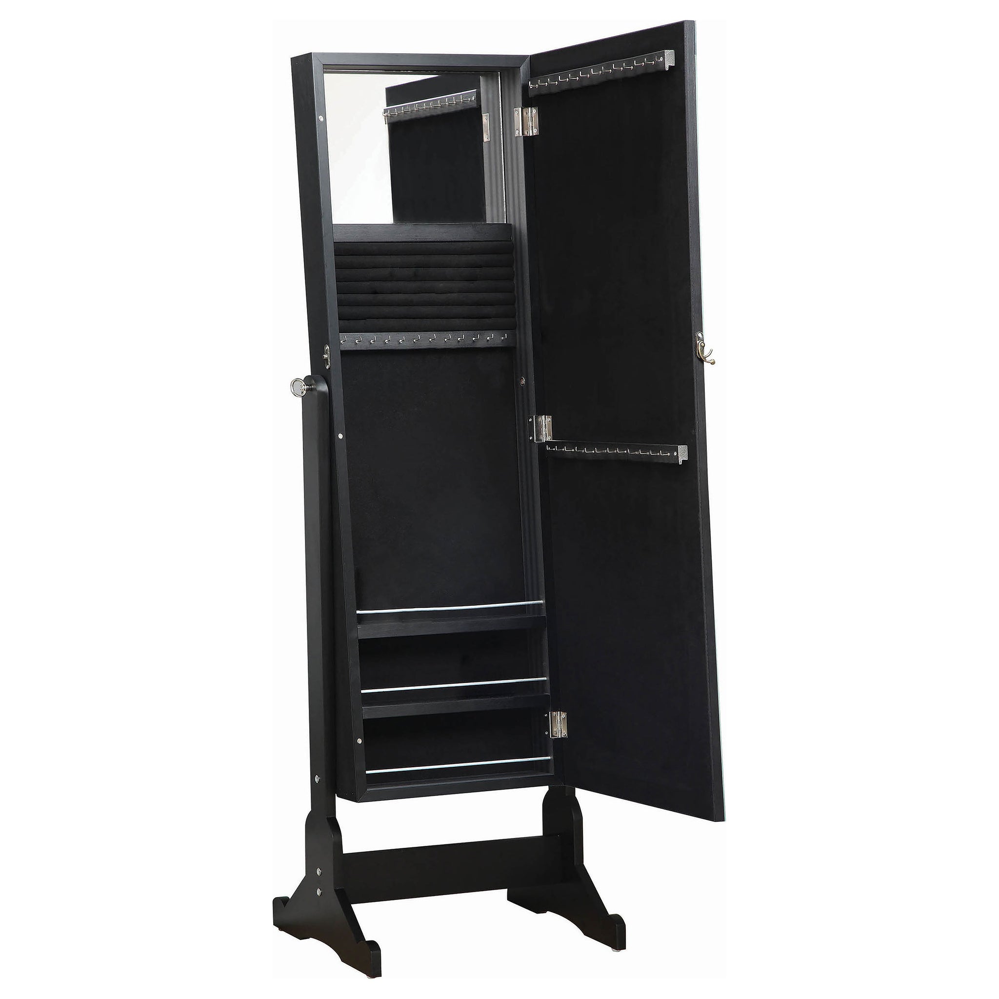 This brilliant multi-function jewelry Cheval mirror serves its purpose(s) in style. It's almost five feet tall, so it's got enough reflection to make sure you look great for stepping out. Open it up to three lower horizontal shelves and enough hooks and right holders for all your precious rings and necklaces. A built-in jewelry box that's four inches deep protects the rest of your precious accessories. Finished in majestic black, it also easily tilts for convenience that's also stylish. Key Features: • Contemporary style with continuous mirrored front against chic black frame • Features full length tilting mirror • Three lower horizontal shelves hold beauty essentials • Plenty of hooks and ring holders for an extensive jewelry collection • 4" deep jewelry box
