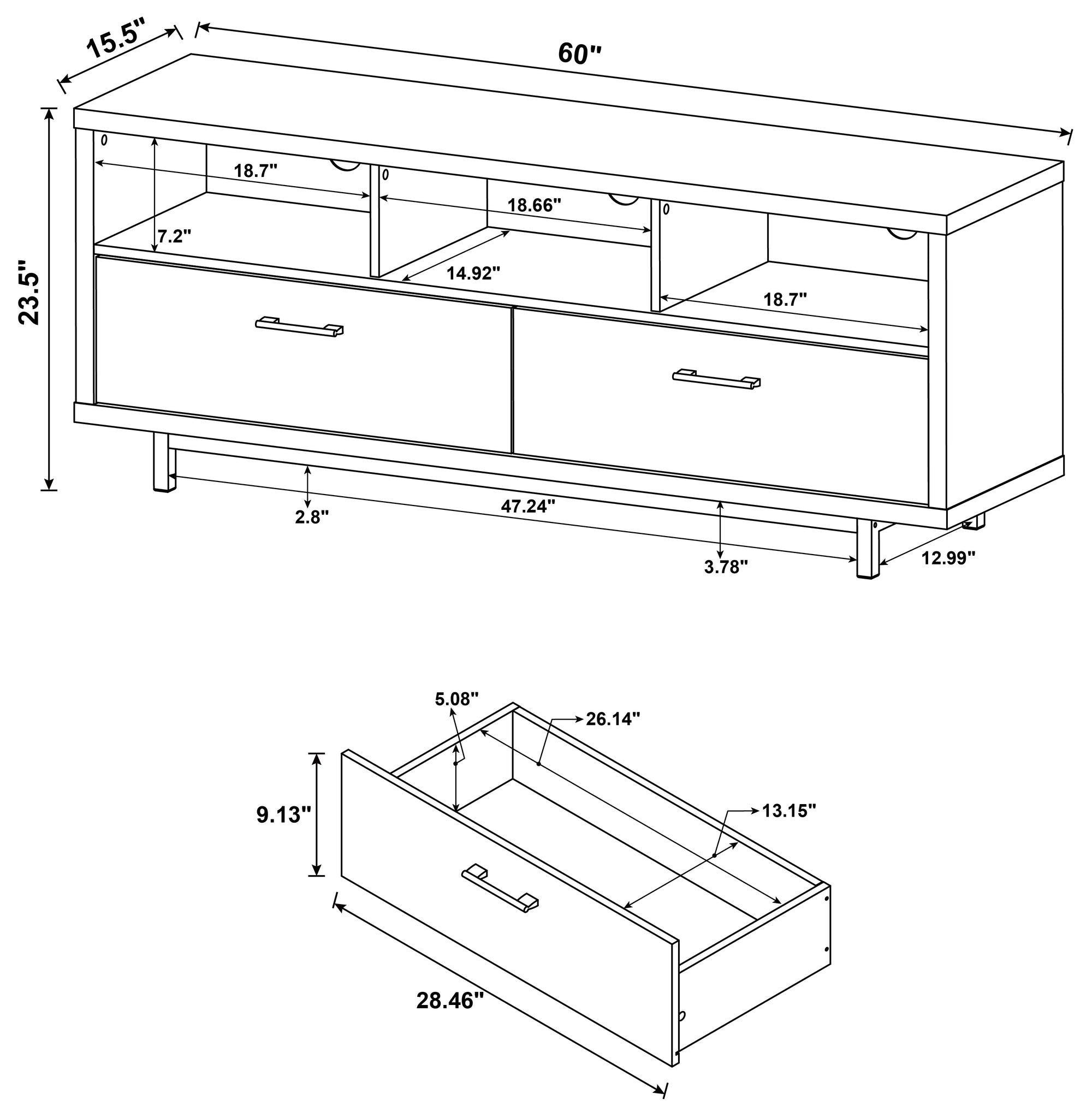 Ideal for a living room with contemporary decor, this TV console exudes updated style. The dazzling shine of chrome combines with a crisp, clean white finish for a pleasingly modern look. Its chic silhouette is complete with an elegant brushed silver frame, adding a pleasing touch of polish. Endlessly versatile, it features three open storage compartments and two large lower drawers to easily keep your space organized. For added depth and a more subdued look, this console is also available in deep, rich cappuccino. Key Features: • TV console finished in white with metal base finished in chrome • Constructed with MDF, particle board, laminate, and steel • Features three (3) storage compartments and two (2) storage drawers • Available in white and cappuccino • Euro drawer glides