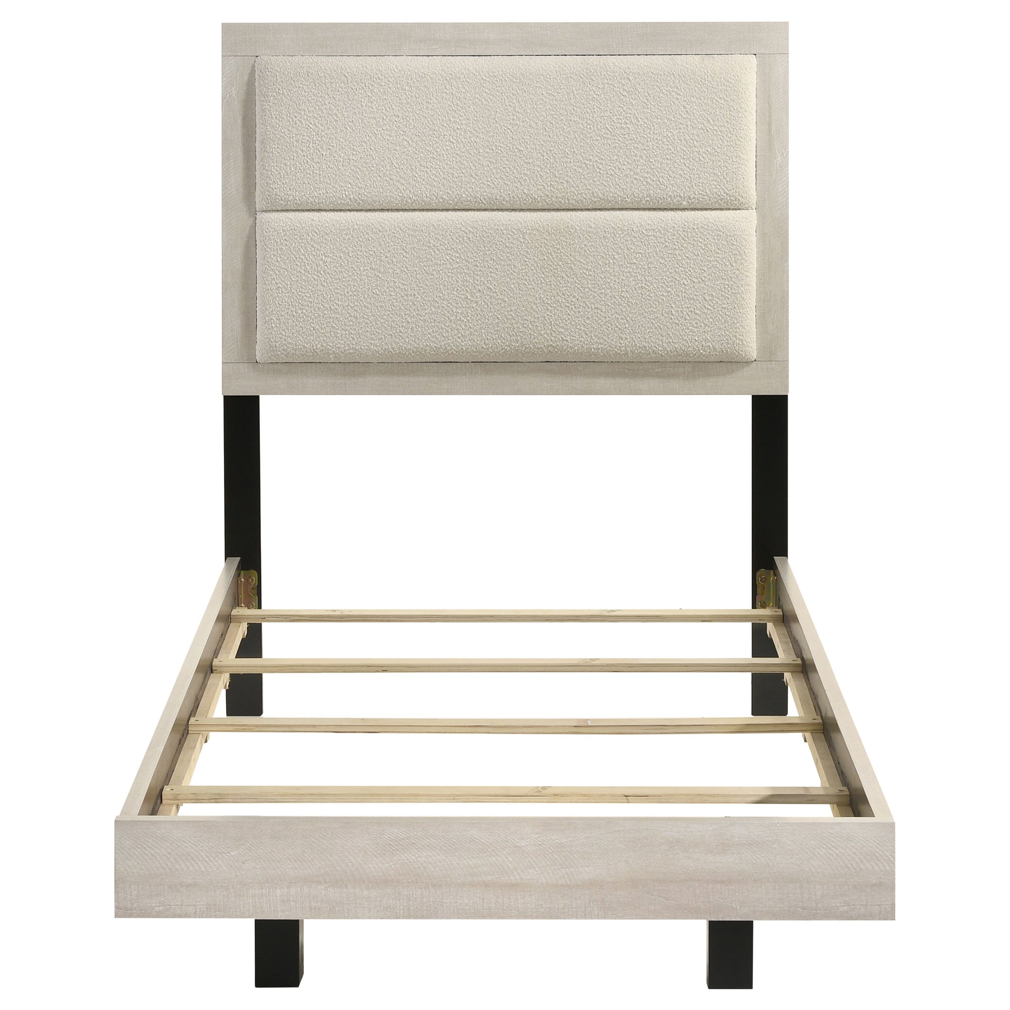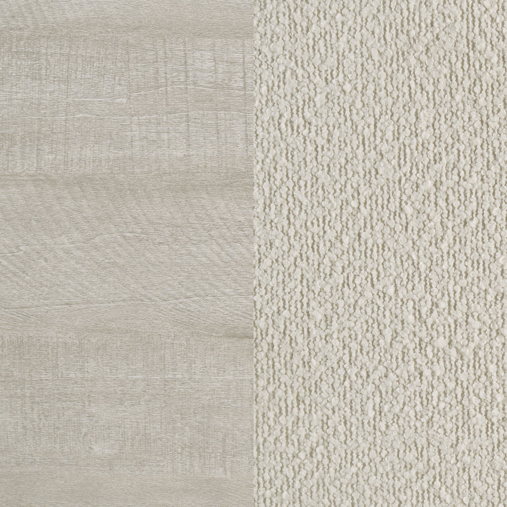 This contemporary bed is the perfect fusion of style and comfort, designed to bring a cool, modern vibe to any bedroom. With its unique "floating" effect, it creates a sense of spaciousness and sophistication. The headboard is upholstered in a soft, cream bouclé fabric, adding a touch of texture and warmth that complements the bed's rustic cream finish. Crafted from asian hardwood and engineered wood with a rough-sawn, white-washed engineered paper veneer, this bed showcases a Yin & Yang contrast between rustic and refined design elements.