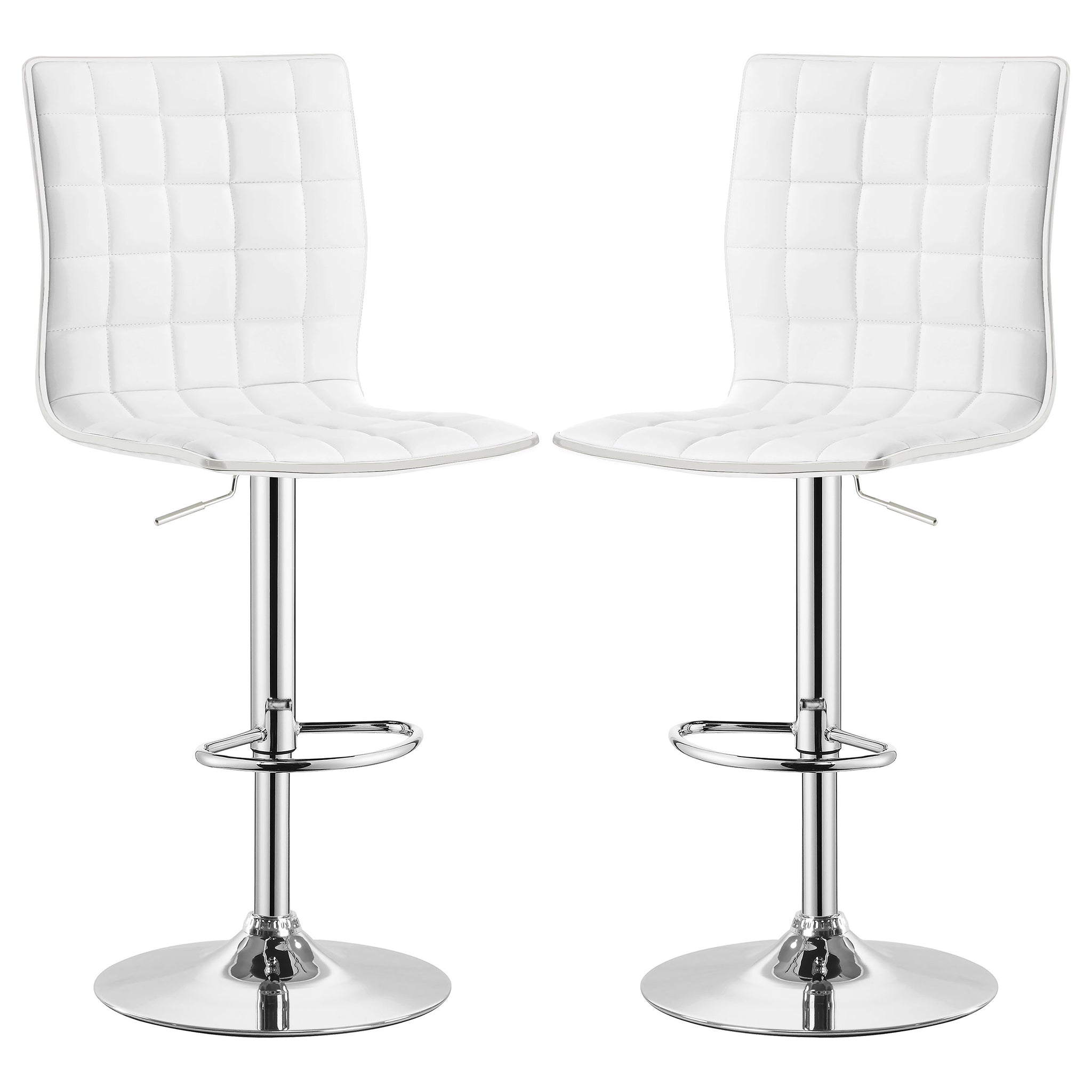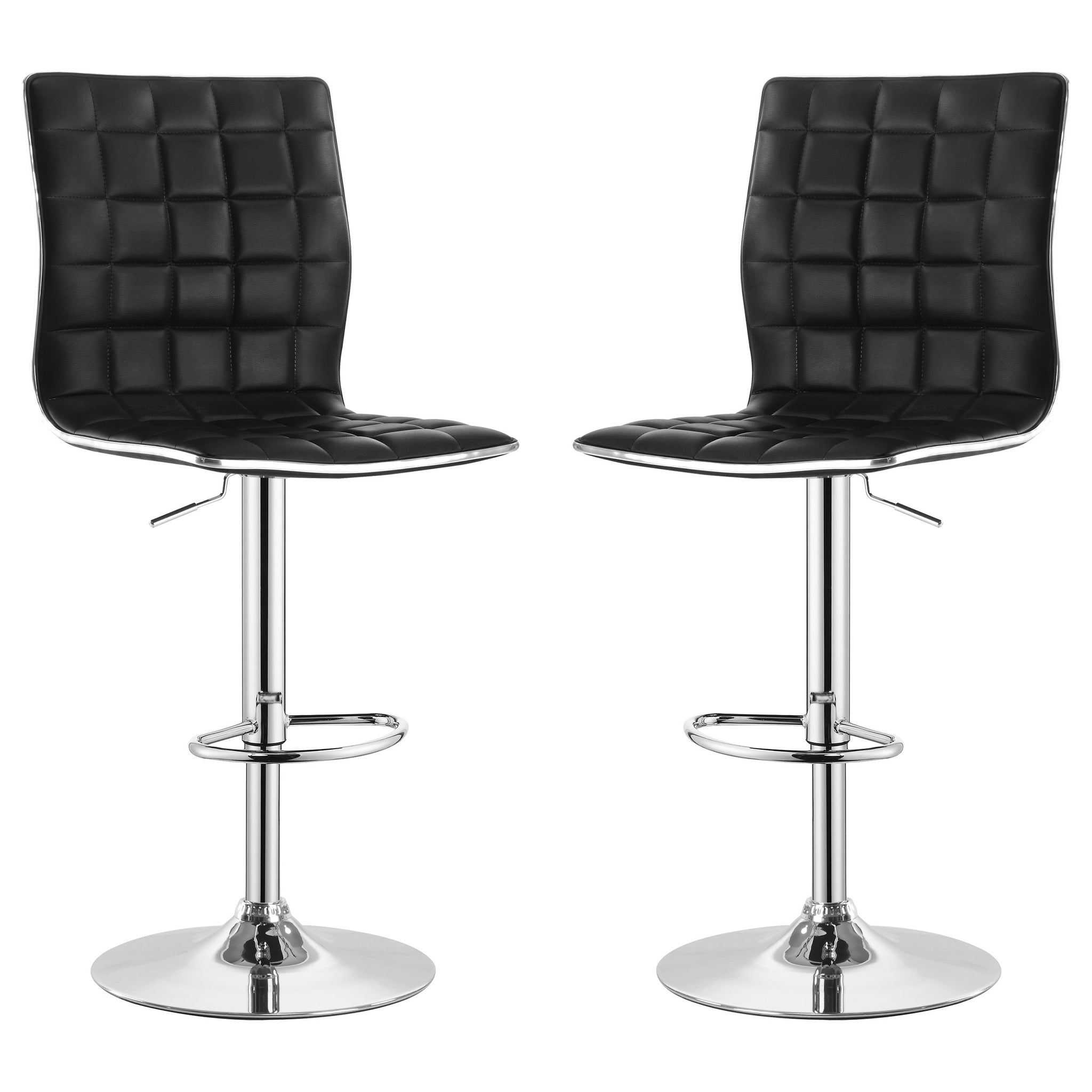 Intersecting vertical and horizontal stitching creates appealing waffle texture on this contemporary adjustable barstool. Easily rising and lowering to meet your special needs, this stool offers a modern silhouette with comfortable and supportive seating. Upholstered in black leather-look fabric, chrome accents add gleaming flair. A pedestal base with a round foot delivers a familiar but stylish profile. A built-in footrest encourages friends and family to linger over a great drink or delicious dessert. Key Features: • Intersecting vertical and horizontal stitching creates appealing waffle texture on this adjustable barstool with modern silhouette and comfortable seating • Upholstered in black leather-look fabric, chrome accents add gleaming flair to pedestal base with round foot • Easily rising and lowering to meet your special needs, built-in footrest encourages friends and family to linger • Chrome accents add gleaming flair to modern silhouette with comfortable and supportive seating • Pedestal base with round foot delivers a familiar but stylish profile