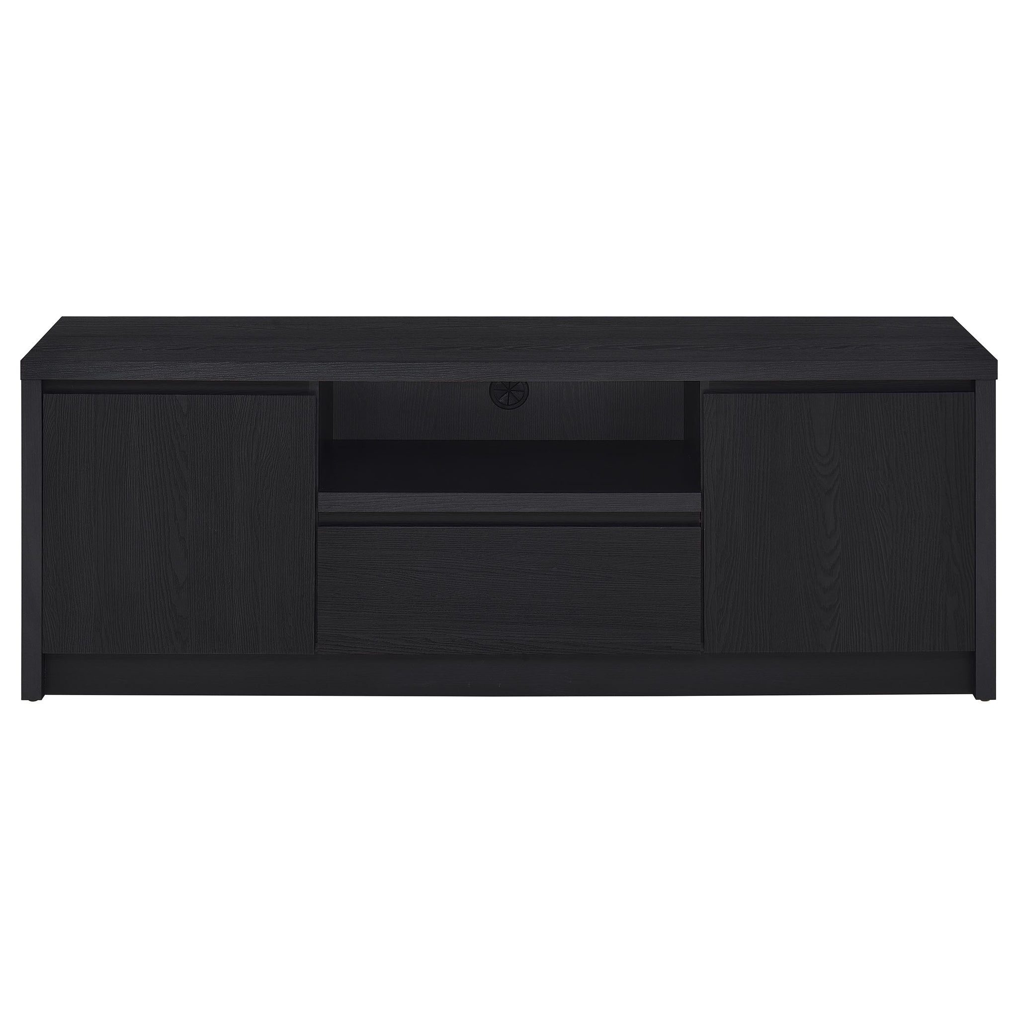 This modern entertainment center combines a sleek TV stand with two matching media towers, offering style and functionality. Finished in a bold black with a scratch-resistant eco-friendly laminate veneer, this unit provides ample storage and display options. The TV stand features cabinets, an open shelf with cable management, and a wide drawer, while each media tower includes open shelves and a bottom cabinet for organized storage. Perfect for creating a cohesive entertainment space in any living room.