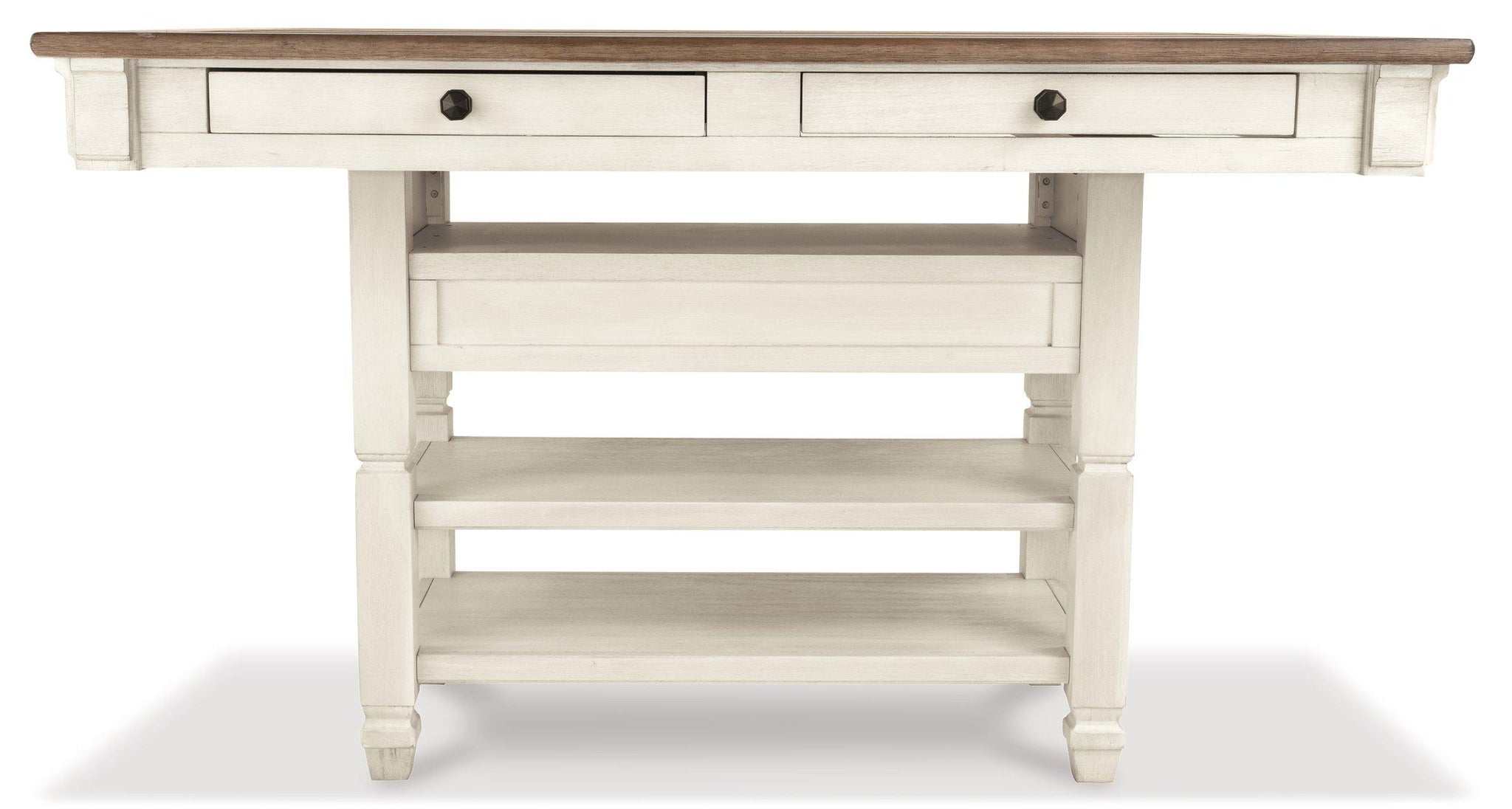 Enjoy beautiful cottage style with this counter height dining table set. With a rustic planked top, this table serves up casual with a vintage twist. The gently distressed tabletop, paired with the rake-back design of the bar stools in a textured antique white finish, is a perfect set for impromptu gatherings. With four built-in drawers, you can keep placemats, napkins and utensils on hand for maximum practicality in any living space. For a quaint ensemble you're bound to love, choose this Bolanburg set.