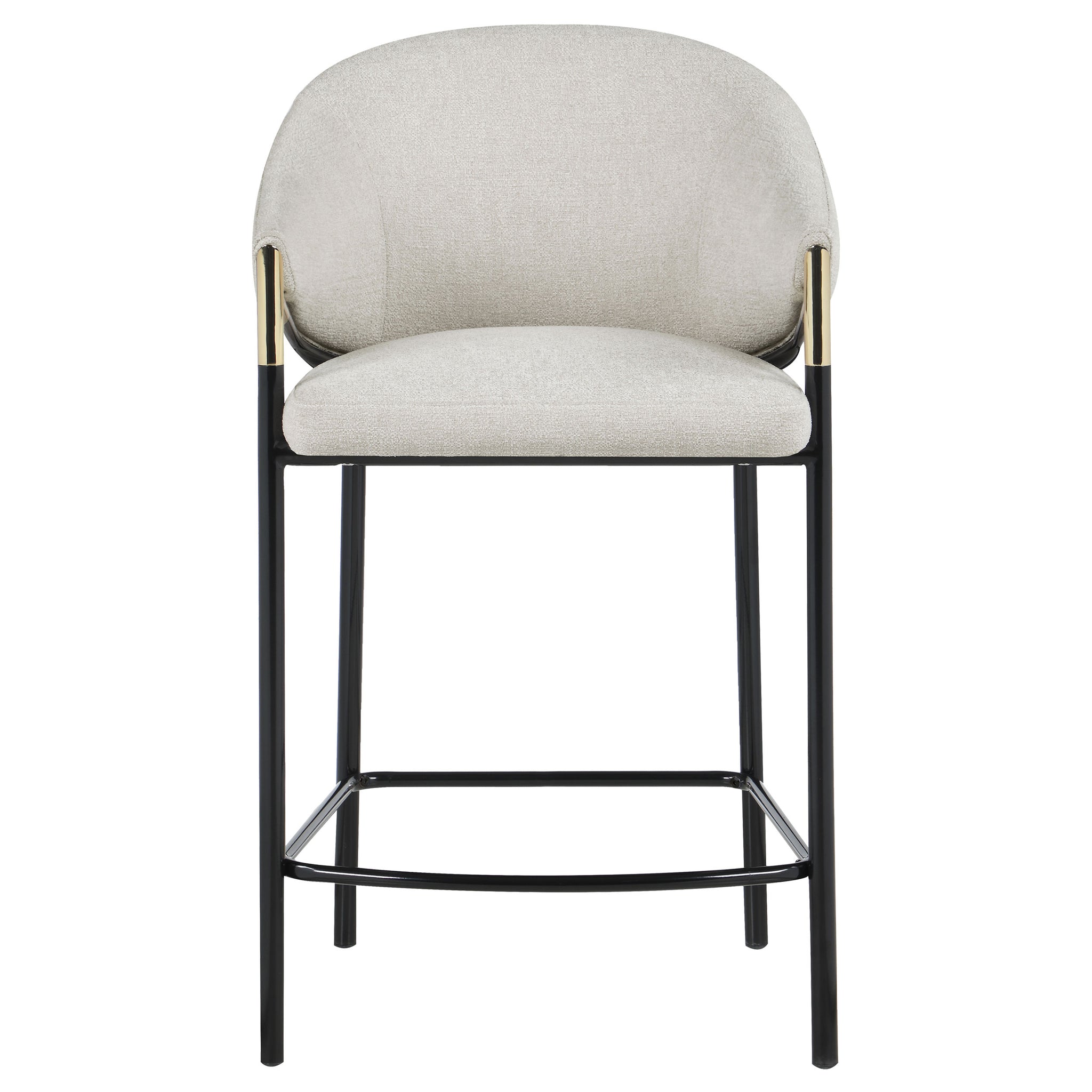 This pair of two stools offer a Hollywood regency look. With a tall and sleek design, the legs come in a glossy black finish that lends to many color palettes and offers a handsome look. Each stool has a cushioned seat, wrapped in a linen-like fabric that is soft to the touch. Plus, lean back and relax between sloped arm rests and a curved high back as you sip cocktails and chat with guests. Capping each arm rest is a gold accented piece that adds a glamorous touch. Key Features: • Tall and sleek design with glossy black finish for versatile color palettes and handsome look • Cushioned seat wrapped in linen-like fabric for soft touch and comfort • Sloped arm rests and curved high back for relaxed seating • Gold accented pieces on arm rests for glamorous touch • Hollywood regency look for stylish addition to any room