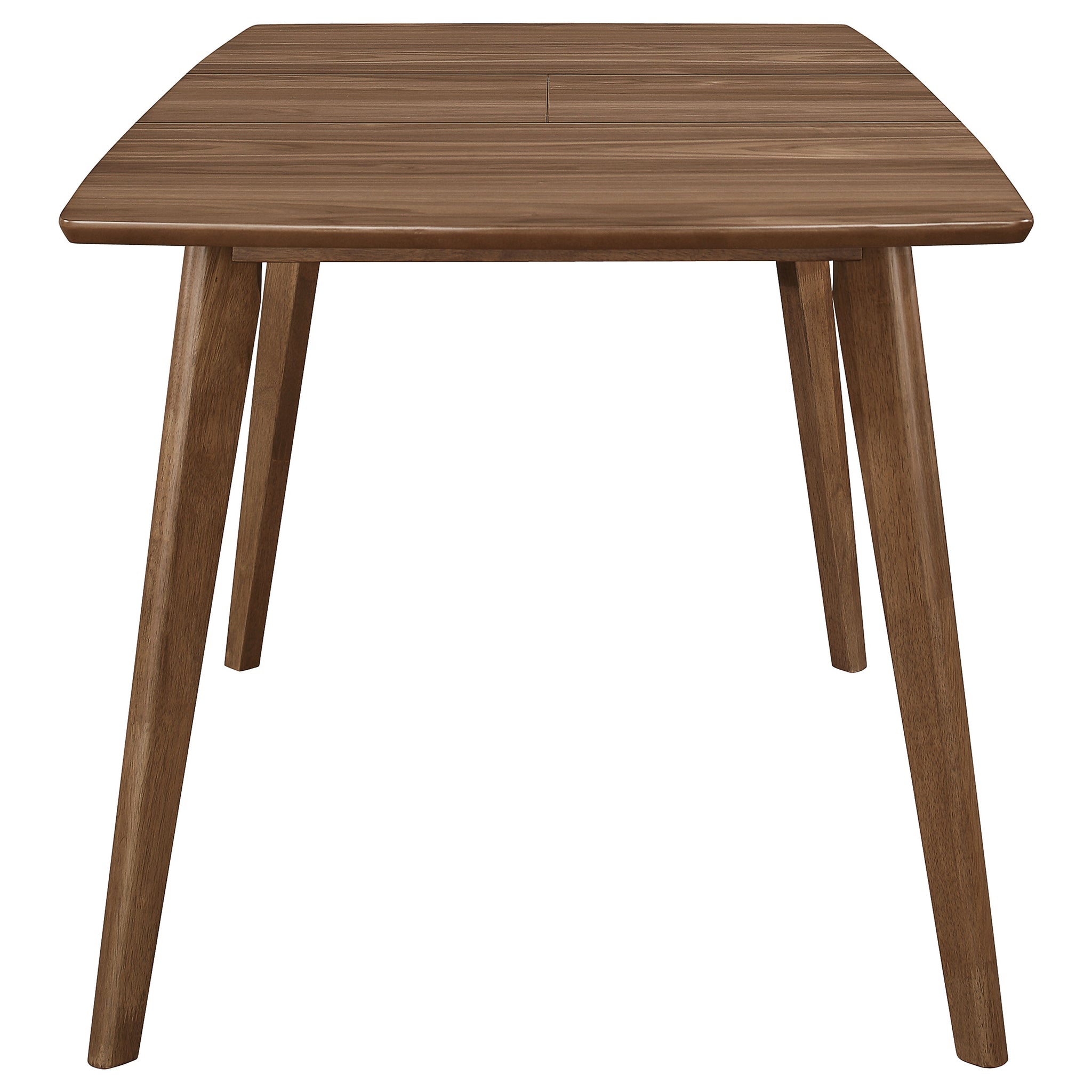 Mid-century modern-inspired, this five piece dining set welcomes a hint of retro pizzazz. In a natural walnut hue, the sleek table is given depth by an exposed wood grain. Tapered legs create an elegant and open look, elevated with clean style. The four included side chairs feature an armless silhouette and grey upholstered seat. The delicate cushion and streamlined back look mod and stylish. Key Features: • Five-piece mid-century modern dining set with clean lines and warm natural walnut finish • Table features a butterfly extension leaf for added seating flexibility and function • Tapered legs and open-frame structure evoke a retro-inspired, airy aesthetic • Chairs include contoured half-moon backs and grey upholstered seats for comfort • Solid rubberwood and walnut veneer construction ensures lasting durability and style • Perfect blend of simplicity and sophistication for modern or transitional interiors