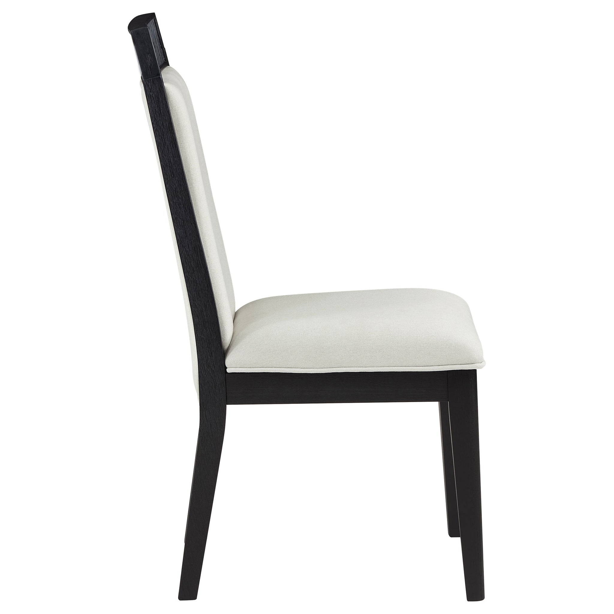 Inspired by trending interior design aesthetics increasingly mixing modern and traditional elements to invent its own style, this five-piece wood dining set stands out to impress. Crisp, clean style and a contrasting color and finish palette begin the dramatic look of a set suitable for both modern and transitional settings important to your everyday living. Distressed black finish wood construction on all pieces gains attention to a minimalist table design with straight, flat leg sections under a sleek top with linear silhouetting and a dimensional top chamfer curving along its edges. Chairs offer a clean silhouette with black finish wood framing, tapered legs, and ornate notched tops with linear carvings thrown in for extra dimension. Soft ivory fabric upholstery is intriguingly placed on both sides of top cushions and over a padded seat. Key Features: • Modern or transitional spaces embrace a five-piece dining set with a simple motif and contrasting finishes/colors • Contemporary style weaves together linear silhouetting in a table with slight top chamfer curving • Black finish wood construction with wire brush distressing is bold, versatile, and textural • A convenient removable tabletop leaf extends length by 18 inches to accommodate a larger party • Chair design features a bordered look with contrasting black wood finish and soft ivory upholstery • Crisp geometric chair top emblems add a textural look with vertical grooves and notched edges