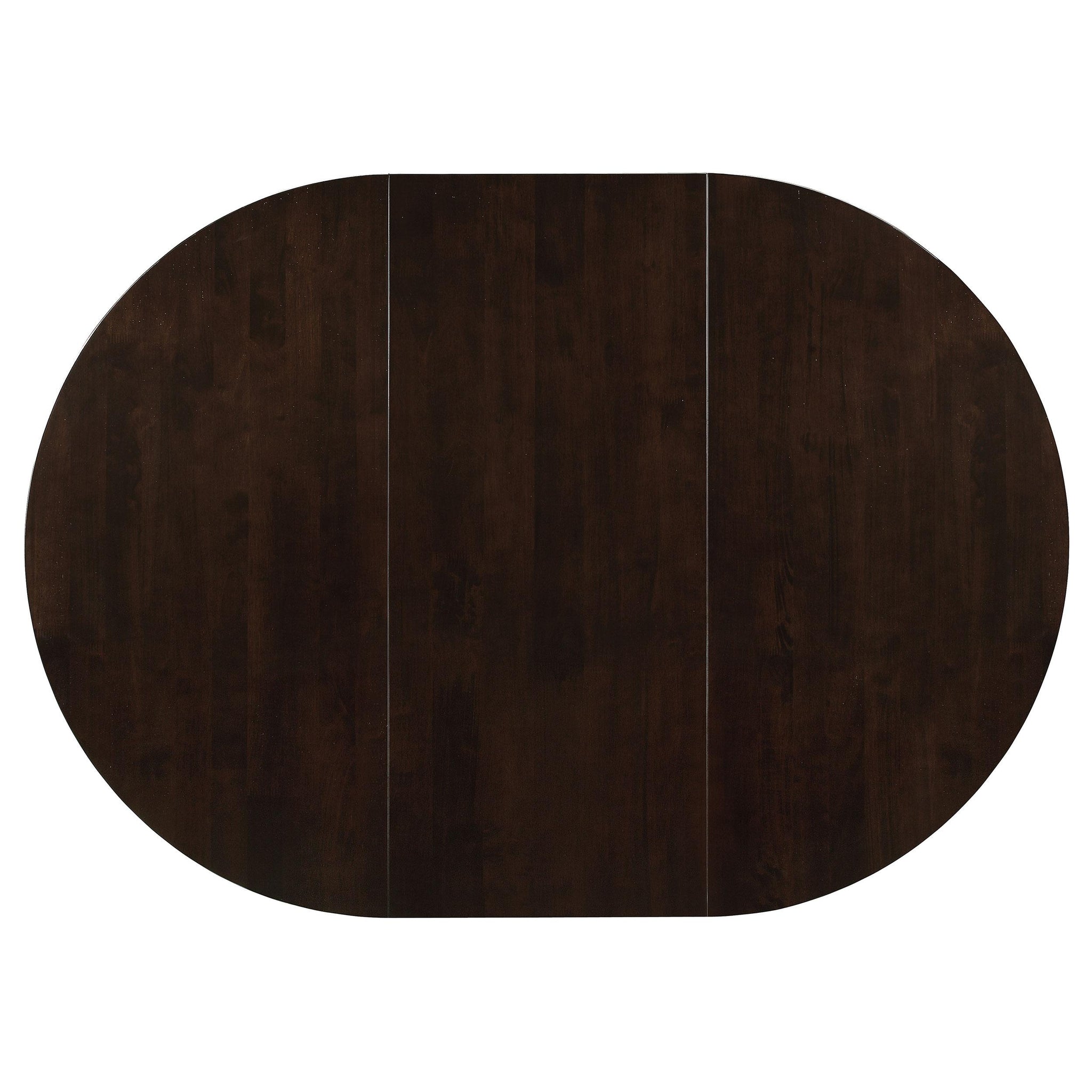As sunlight filters through the window, it casts a warm glow on the lustrous dark cappuccino finish of this timeless dining set, inviting a sense of calm to mealtime gatherings. The oval table, adorned with a meticulously crafted wood veneer top, boasts an 18-inch extension leaf that promises to accommodate the ebb and flow of guests with grace. Surrounding the table, four side chairs with lattice backs whisper stories of traditional elegance, their cushioned seats upholstered in a tactile fabric that begs to be touched. This set, a harmonious blend of solid hardwood strength and delicate design, transforms everyday dining into a luxurious affair. Here, comfort meets quality, and style creates the backdrop for memories in the making. Key Features: • Oval dining table set with 18-inch extension leaf • Table and chairs finished in a rich dark cappuccino hue • Chairs feature lattice back design and cushioned seats • Soft fabric upholstery on chair seats for enhanced comfort • Constructed from solid hardwood with a wood veneer table top