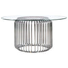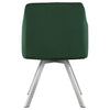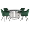 Nestled amidst the verdant embrace of potted palms, the Art Deco-inspired dining table is a modern masterpiece, its cylindrical form enshrouded by gleaming metal rods that whisper tales of Gatsby-esque opulence. A clear, tempered glass top, expansive at 60 inches, floats like a crystalline pond above the polished chrome base, inviting an array of tablescapes to dance upon its surface. Surrounding this sculptural piece, four sumptuous green velvet chairs beckon, their channel tufted backs and swiveling seats echoing the luxury of a bygone era, yet firmly rooted in contemporary comfort. The table and chairs, a marriage of retro flair and modern lines, stand as a stunning focal point, inviting guests to linger over shared meals and conversations that sparkle as brightly as the chrome finishes that bind them. Key Features: • Five-piece dining set with round table and four chairs • Table with 60" clear tempered glass top and cylindrical cage-like metal base in polished chrome • Chairs with bucket style seats, vertical channel tufting, and soft green velvet upholstery • Swivel mechanism on chairs with sharply angled polished chrome legs • Suitable for modern dining rooms, pub settings, or as a sophisticated addition to a media room