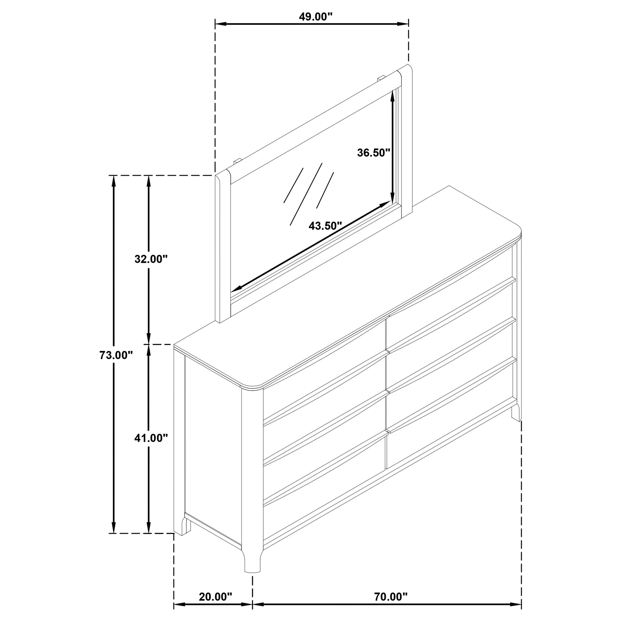Introduce the earthy character of beautiful walnut with this transitional eight-drawer dresser and mirror combination. It delivers plenty of space for clothing and accessories, with a wide top for decor and personal items. The mirror adds lightness and reflectivity, complete with a wooden frame and beveled glass for a refined look. The dresser boasts a walnut veneer finish, adding the character of wood grain details to your bedroom. Drawers include felt lining in the two top, with cedar that adds protection against pests. Key Features: • Enhance your bedroom with the handsome profile and storage of an eight-drawer dresser and mirror • Dresser and mirror frame feature rounded corners and glass is beveled for depth • Walnut wood veneer lends warmth and creates a touch of texture with natural grain patterns • Top drawers are complete with dark brown felt lining, offering easy protection for delicate items • Drawers feature cedar lining that helps to protect against pests and provides excellent quality