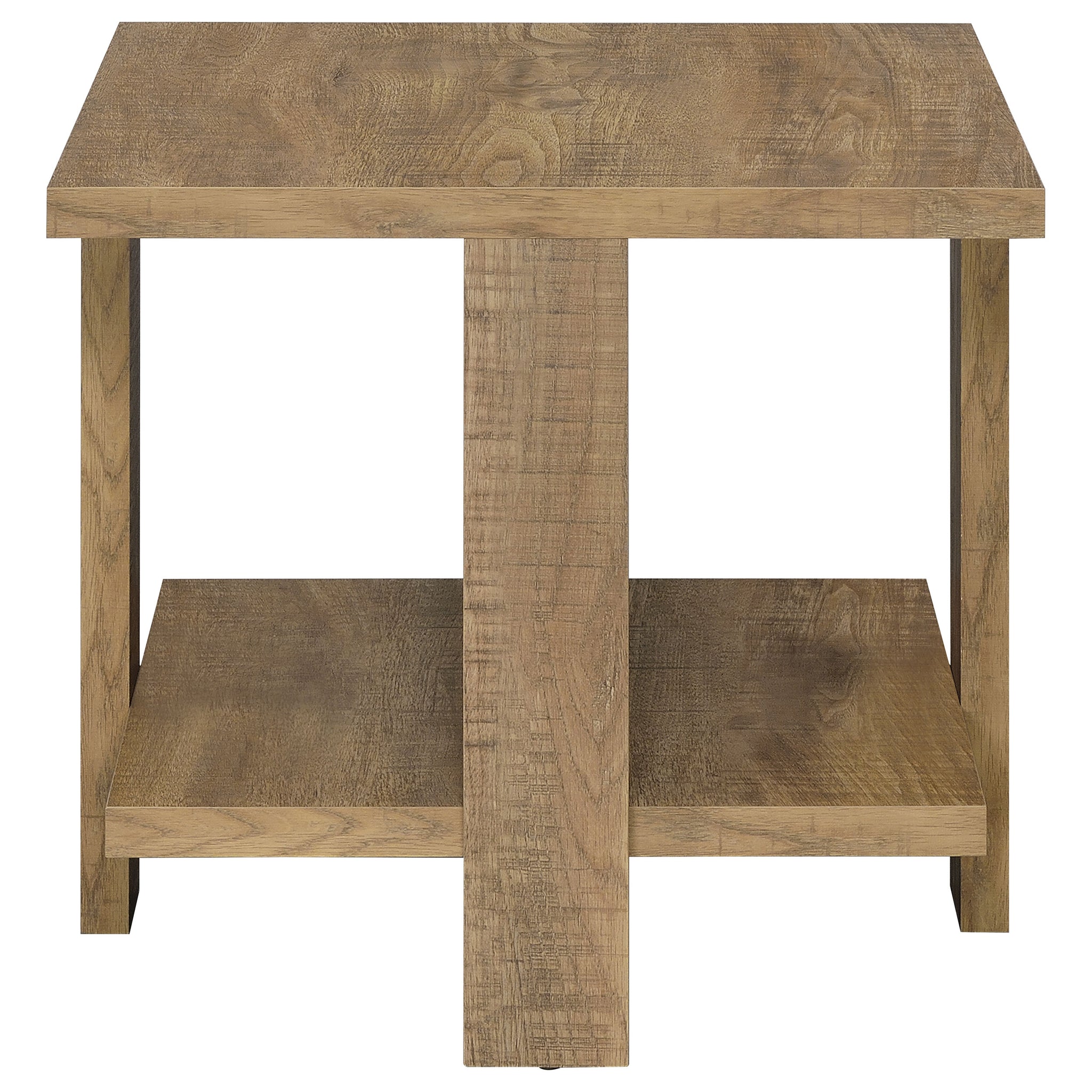 An effortless look of organic simplicity adds intrigue to your casual modern space, offering a place to display and serve as needed. This square end table is built of mango finish laminate veneer over engineered wood with an authentic rough sawn look. Rustic and inviting, it suits your thirst for style and functionality with two surfaces. Wide board-like legs complete its linear design. Embrace a crisp vibe in a side table devoted to earthy organic beauty. Key Features: • Square end table with two surfaces for display and storage purposes • Engineered wood construction with a mango wood finish and rough sawn look • Rustic design with wide, board-like legs enhancing the linear structure • Perfect for modern spaces seeking organic beauty and functionality • Ideal for serving or storing essentials in casual living areas • Easy-to-clean laminate veneer ensures durability for everyday use