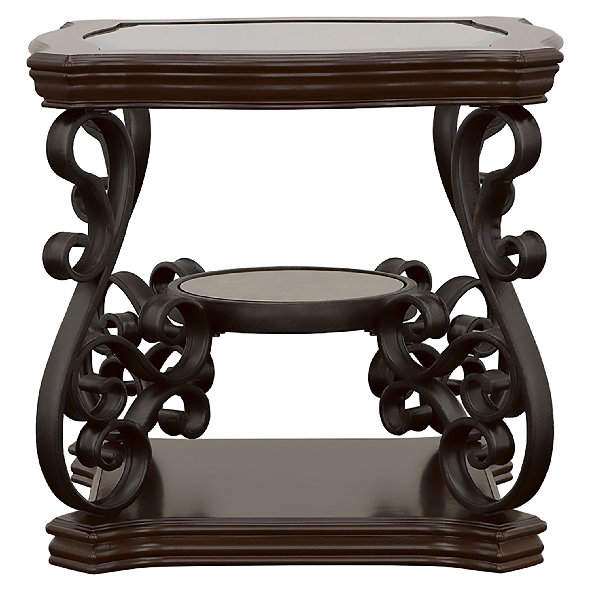 This elegant end table brings a blend of classic style and practicality to any living space. The clear tempered glass top offers a durable and polished surface, complemented by ornate scrollwork on the dark bronze powder-coated metal legs. The dark merlot finish highlights the engineered wood and cherry veneer construction, while the small middle shelf adds functionality with a polished wooden surface. Perfect for enhancing your living room with timeless charm and versatile utility. Key Features: • End table with a clear tempered glass top for a durable and elegant surface • Metal legs with a dark bronze powder-coated finish enhance sophistication • Dark merlot wood finish complements engineered wood and cherry veneer • Middle shelf with a polished wooden surface adds storage or display options • Intricate scrollwork design provides a classic and ornate aesthetic • Built with durable mixed materials of metal, wood, and veneer