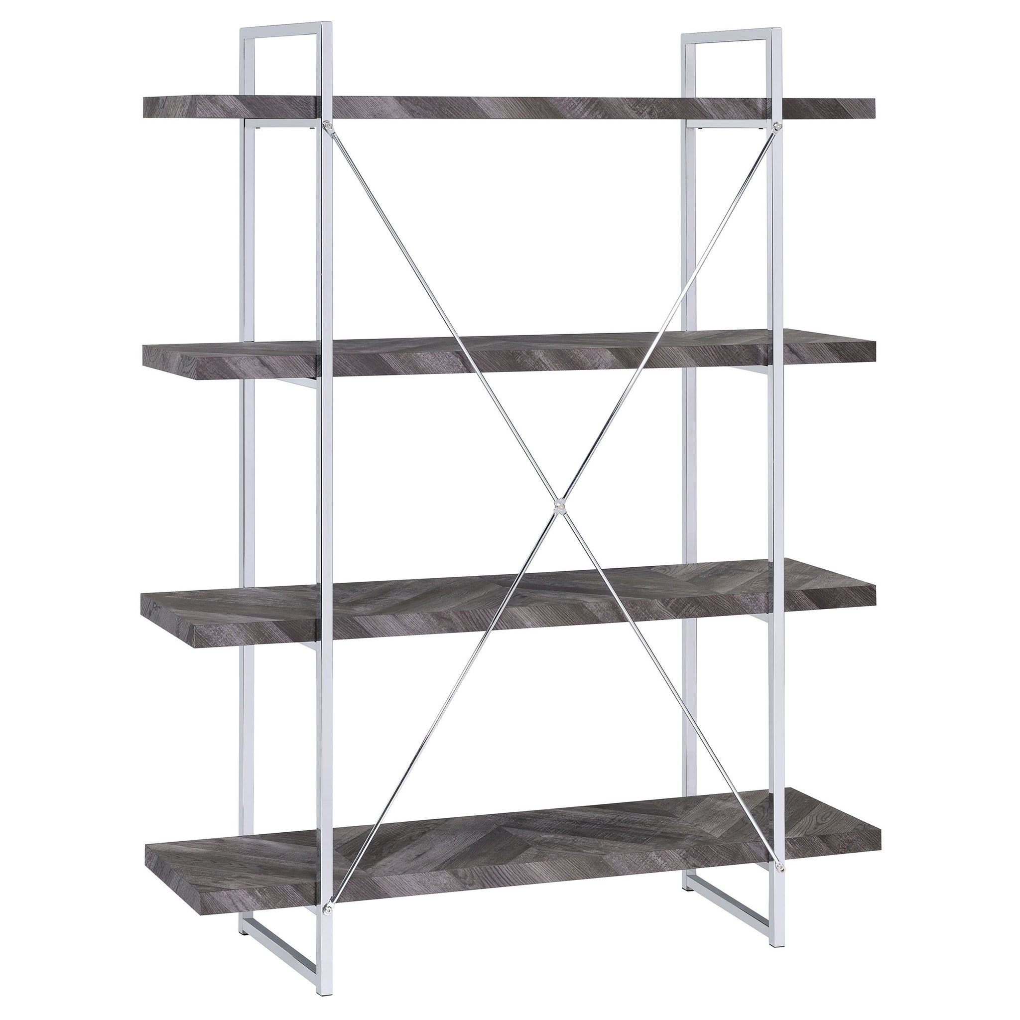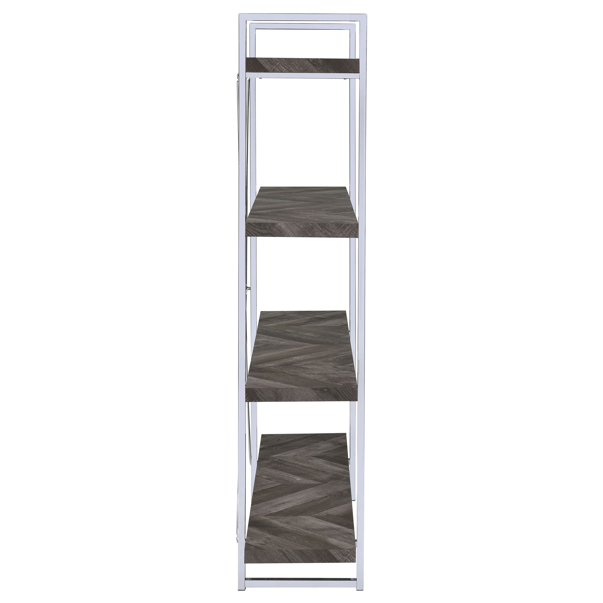 Enhance your storage and display space with this contemporary bookshelf, featuring a rustic grey herringbone finish for a modern organic touch. The sleek chrome metal frame provides durability and style, complemented by an X-shaped back support for stability. Four open shelves extend beyond the frame, creating a bold, geometric aesthetic perfect for showcasing books, décor, or collectibles. Crafted from engineered wood and metal, this shelving unit blends industrial and modern styles seamlessly, making it a stunning addition to living rooms, offices, or bedrooms. Key Features: • Four-tier bookshelf with a bold open-shelf design for a modern look • Rustic grey herringbone finish adds warmth and organic charm • Sleek chrome metal frame with X-back support enhances durability • Extended open shelves provide ample display space for books and décor • Crafted from engineered wood, MDF, and metal for long-lasting use • Ideal for home offices, living rooms, or contemporary spaces