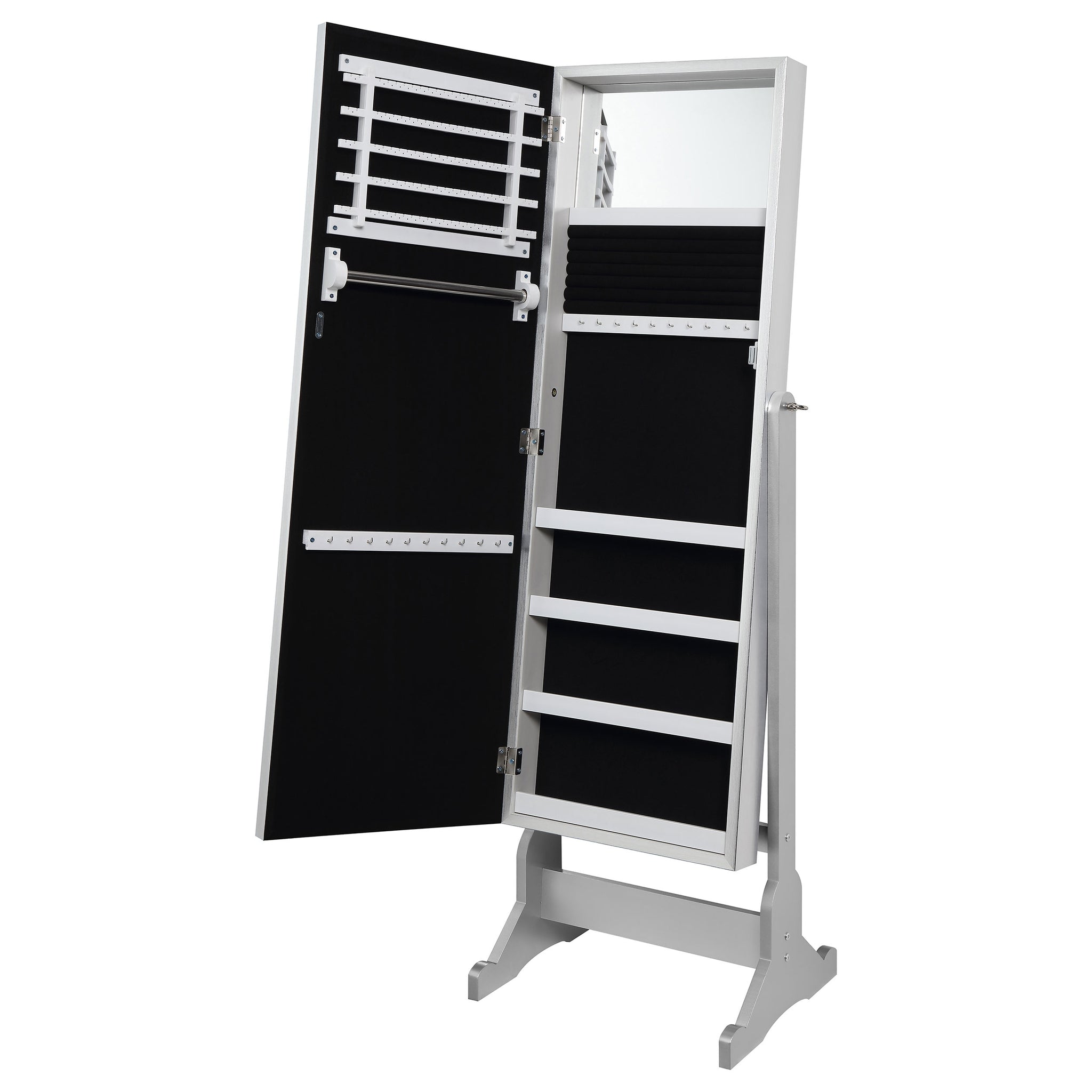 Put the finishing touch on a glamourous bed or dressing room with this stunning floor-length jewelry cheval mirror. Sleek and smooth, the frame features a metallic silver finish. Supportive and intriguing, the delicately curved legs give this mirror its chic personality. Brighten up a space with the light up mirror while keeping your favorite jewelry safe. Angle the mirror upwards or downwards in any bold or neutral decor scheme. Key Features: • Jewelry cheval mirror with LED-lit frame and full-length tilting design • Hidden jewelry armoire includes hooks, ring rolls, and open shelves for storage • Tiltable cheval structure provides adjustable viewing angle for daily use • LED perimeter lighting offers bright, clear visibility while selecting accessories • Freestanding base with curved legs delivers both support and visual appeal • Crafted from engineered wood and mirror for long-lasting functionality and style