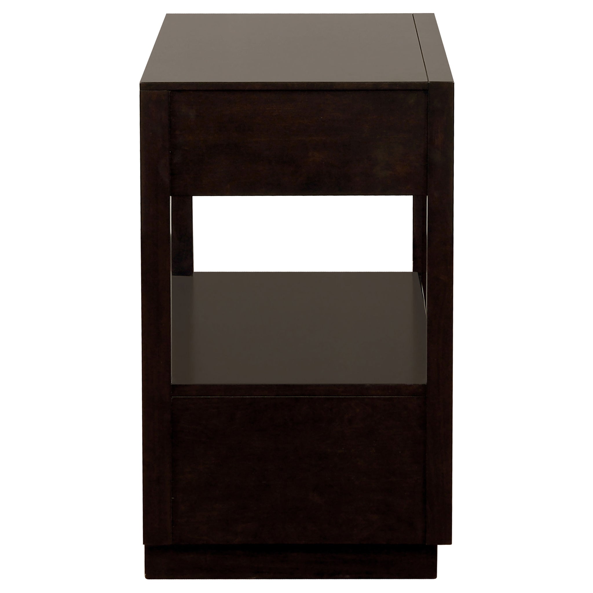 Inspire a retro feel in a modern bedroom with this stunning two-drawer nightstand. Elongated metallic drawer pulls protrude from flat drawer fronts, inspiring a sleek look. In a rich and warm smoke peppercorn finish, the deep hues of the silhouette create a bold visual. The simple and smooth frame creates a structured effect, complete with a smooth base that reaches the floor. Store your bedtime books or favorite sculptures on the shelf between the drawers to add depth to your space. Key Features: • Two-drawer nightstand in a rich smoke peppercorn finish for a modern bedroom • Features elongated metallic drawer pulls for a sleek, retro-inspired look • Constructed with a simple and smooth frame for a structured aesthetic • Includes a shelf between the drawers for additional storage or display space • Stands on a smooth base that reaches the floor, enhancing its bold visual appeal
