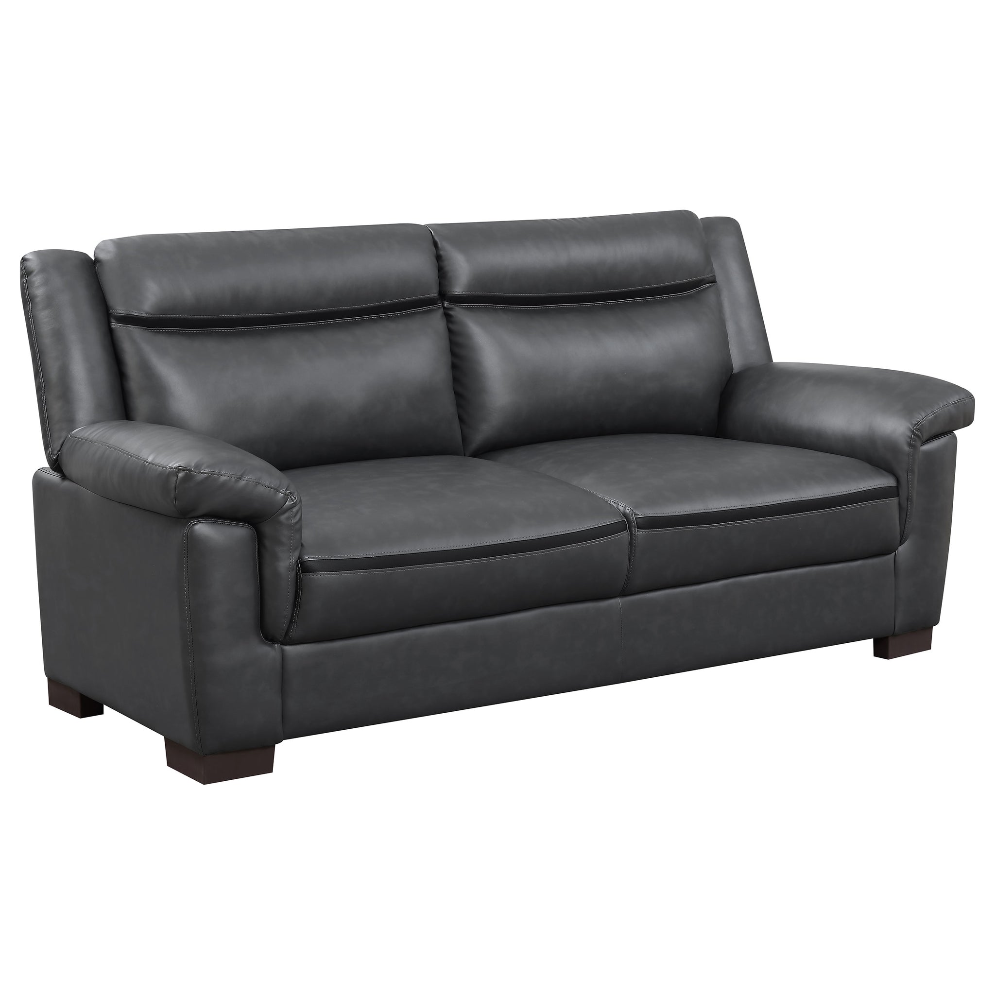 Add modern sophistication and everyday comfort to your living space with this sleek sofa. Upholstered in smooth grey leatherette with subtle stitched details, it brings an updated touch of style to any room. Plush padded seating and pillow-top arms provide exceptional comfort and support, while a sturdy wooden frame ensures durability. Perfectly sized for small or large spaces alike, this sofa blends practicality with a contemporary look, making it a versatile choice for your home._x005F_x000D_ Key Features: • Sofa upholstered in smooth grey leatherette with stitched accents for a sleek modern look • Plush padded seating and wide pillow-top arms deliver long-lasting comfort and relaxation • High pillow back provides additional support, creating a cozy spot for lounging and reading • Dark brown block-style legs lend a grounded finish and add a modern touch to the overall design • Durable wooden frame construction ensures reliable stability and everyday lasting performance • Versatile size makes this sofa an ideal fit for both compact apartments and spacious living rooms