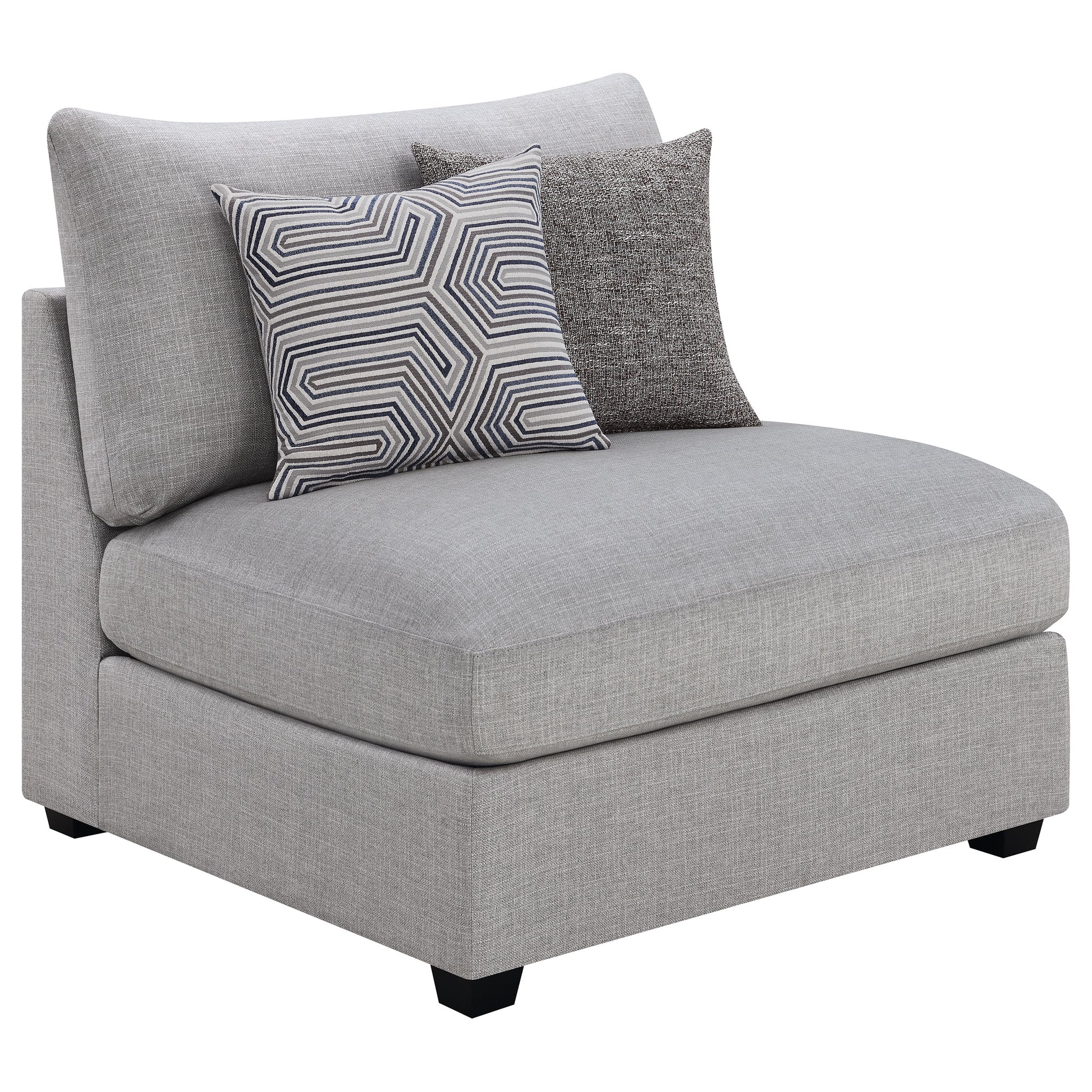 This modular sectional sofa embodies contemporary comfort with clean lines, inviting textures, and customizable flexibility. Upholstered in soft grey fabric, it features supportive cushions wrapped in plush feather-down for an indulgent seating experience. Subtle wedge details and tapered block feet lend modern refinement, while the modular design allows each piece to adapt effortlessly to any space. Perfect for family gatherings or relaxed lounging, it delivers style, durability, and lasting comfort in one cohesive design._x005F_x000D_ Key Features: • Modular sectional sofa with soft grey upholstery offers modern style and plush comfort • Configurable design allows flexible seating layouts for any living room arrangement • Hidden storage ottoman adds versatility for blankets, pillows, or everyday essentials • Plush feather-down wrapped cushions deliver inviting comfort and long-lasting support • Tapered block feet and subtle wedge details enhance its contemporary refined profile • Perfect for relaxing, entertaining, or family gatherings in a cozy modern setting