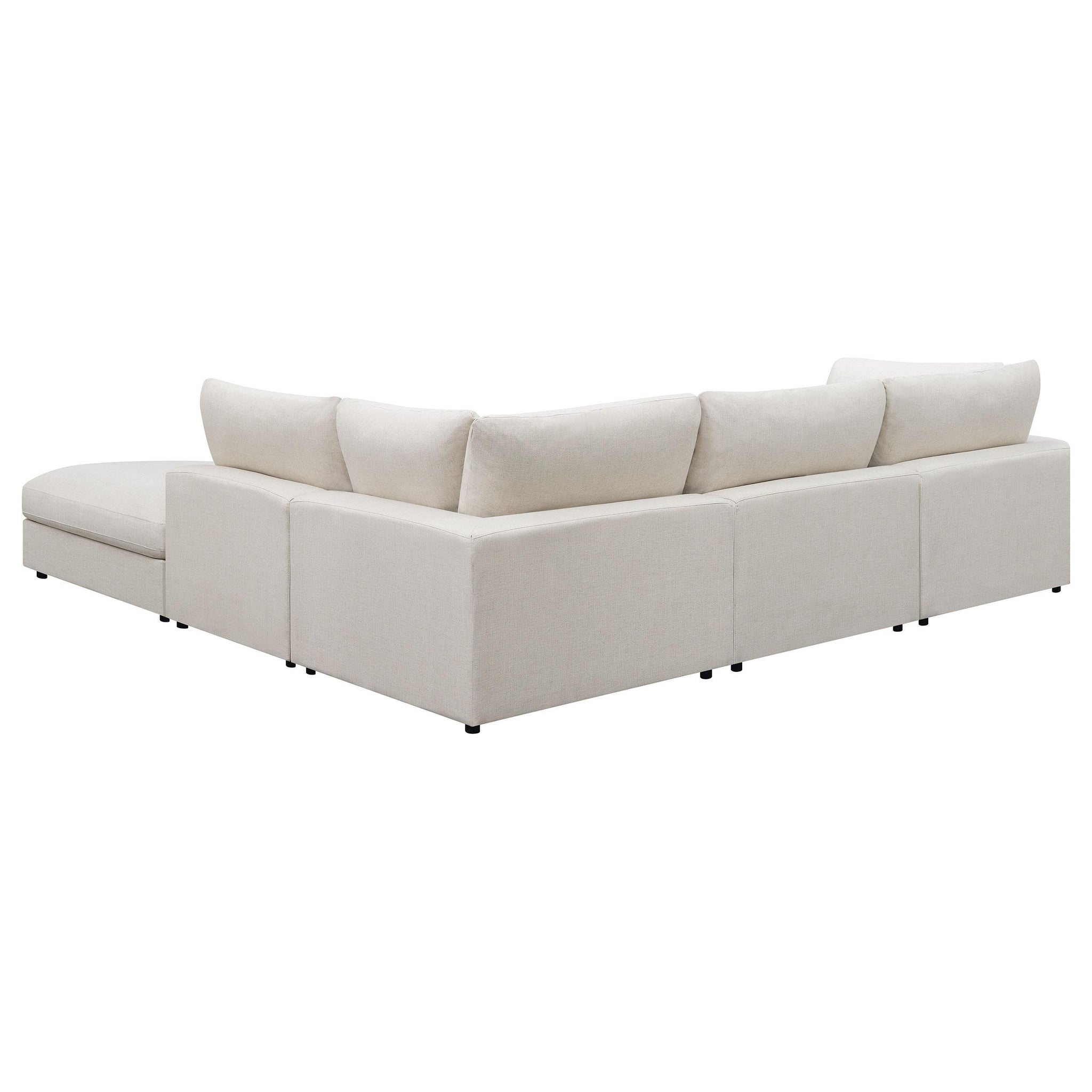 Covered in a linen-like fabric all around, this super comfy five-piece sectional offers all the seating you need in an open concept living room or entertainment area. Designed with two armless chairs, two corner chairs and a single oversized ottoman, this contemporary modular sectional offers reversible back pillows and jacquard accent pillows that you can really sink into. Black feet peer from beneath, offering a slight elevation for rugs and other flooring. With an L-shape design, this sectional works in a variety of room dimensions. A spacious ottoman also doubles as a coffee table, keeping a tray of refreshments and snacks when hosting guests. Key Features: • Experience ultimate comfort with this fashionable sectional • Modular construction allows you to easily build the perfect seating area for your space • Feather blend seat and back cushions for the best seat experience • Accent pillows in a soft jacquard are included • All cushions are reversible making it easy to clean and maintain
