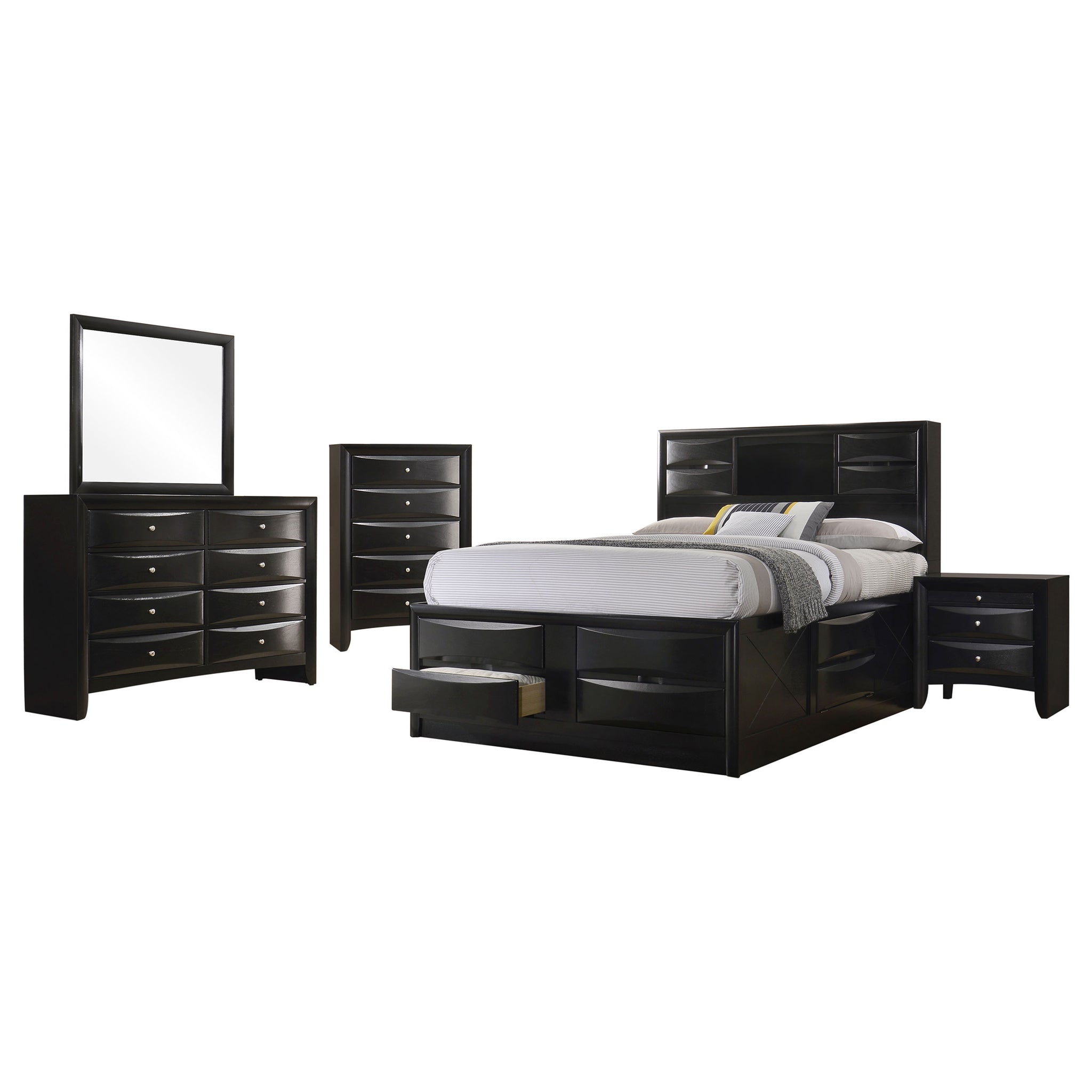 Transform your bedroom with this sophisticated storage bedroom set that combines timeless style and practical function. Finished in sleek black, the platform bed features four drawers in the footboard and hidden compartments behind drop-down doors on the headboard and side rails. The bookcase headboard includes four drawers and a center shelf for accessible storage. Complementary case pieces echo the look with chambered drawer fronts and brushed nickel hardware, creating a refined and cohesive space. Key Features: • Four-piece queen bedroom set with refined transitional styling • Platform bed includes four footboard drawers for added storage • Drop-down doors on headboard and side provide hidden compartments • Bookcase headboard with four drawers and open center display shelf • Chambered drawer fronts enhance texture and dimensional character • Brushed nickel hardware contrasts beautifully with the black finish