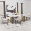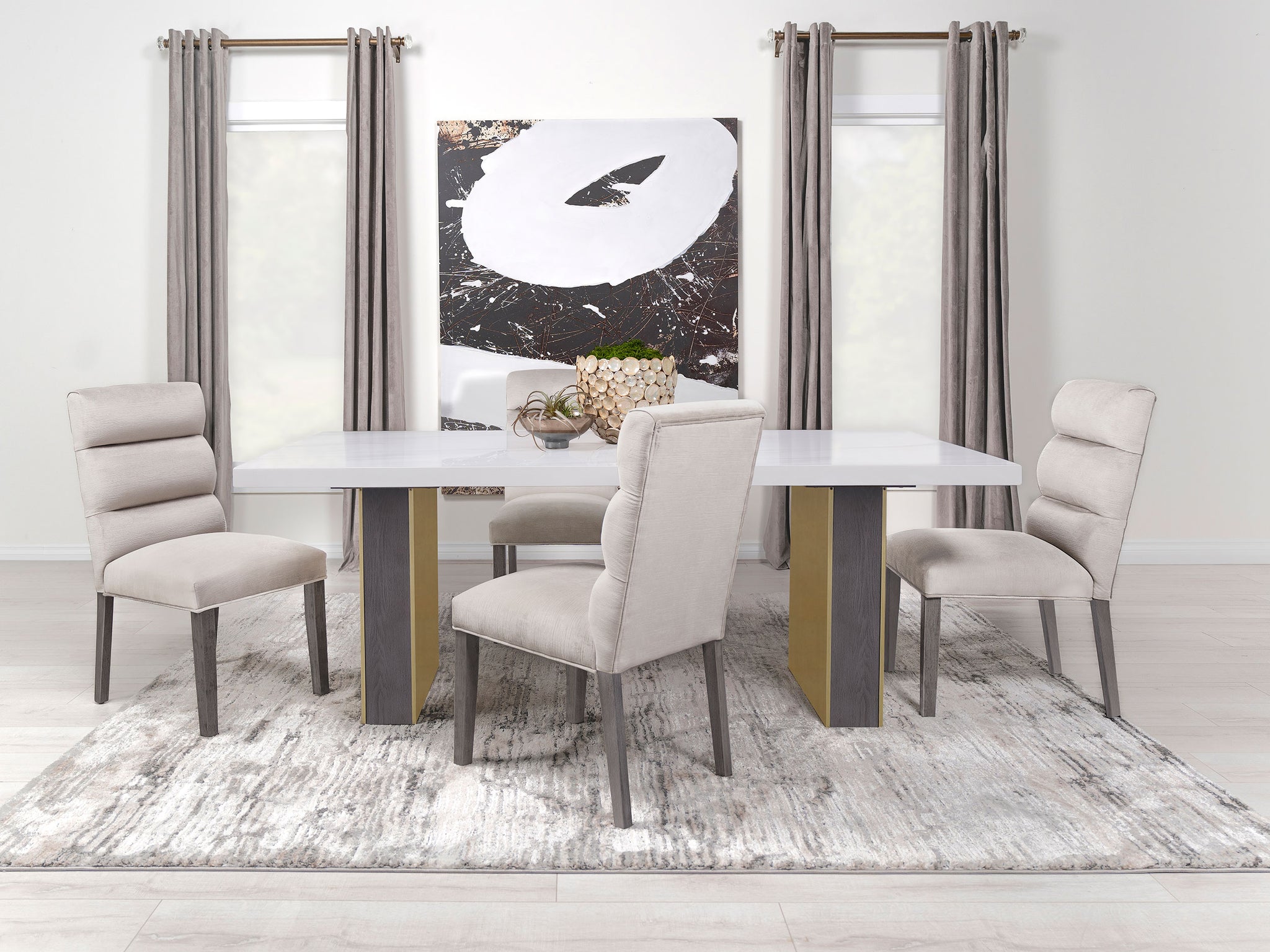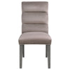 A pillowy look and feel brings ultimate comfort to a casual living space, targeting your kitchen or dining room with a light, floaty vibe, and adding a festive feel. This set of two side chairs checks all the boxes of design, comfort, and easy-living elegance standards you embrace to make a setting fashionable and functional. These chairs feature rubberwood and hickory wood framing, with a cool gray finish over slightly tapered legs. Soft fabric upholstery embellishes a cleverly styled seating unit with an extra-high back and horizontal channeling. A tight yet plump seat provides perfect balance to round out a sleek design. Key Features: • Modern style offers a fresh design bridging contemporary and casual as this side chair set is versatile • Superb comfort and chic style follows horizontal tufting with extra plump foam fill on seat backs • Soft fabric upholstery with a neutral color is a stylish, perfect fit for most settings • Cool gray wood legs are straight in front and slightly tapered in back, creating a charming look • Plump foam fill in tight seats add comfort for long periods of sitting and a balanced design