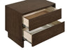 Add easy storage at your bedside with a modern two-drawer nightstand. Delivering streamlined style and a fresh, clean presentation, the nightstand boasts a warm brown wood grain finish. Its drawers are roomy and useful, complete with felt lining in the top, adding protection for everything from accessories to electronics. Mitered trim adds a sense of precision to the drawer case, while fingertip pulls ensure a smooth look and feel. Wide legs add stability and structure, while delivering lift that adds airy flair in a modern space. Key Features: • Clean, straightforward design details bring stylish flair to a modern two-drawer nightstand • Crafted from solid wood in a warm brown finish • Fingertip pulls create a smooth, flat drawer front design, adding to a streamlined look and feel • Top drawer includes felt lining in a dark brown color, adding protection for delicate items • Drawers feature English dovetail joinery and metal glides for excellent performance