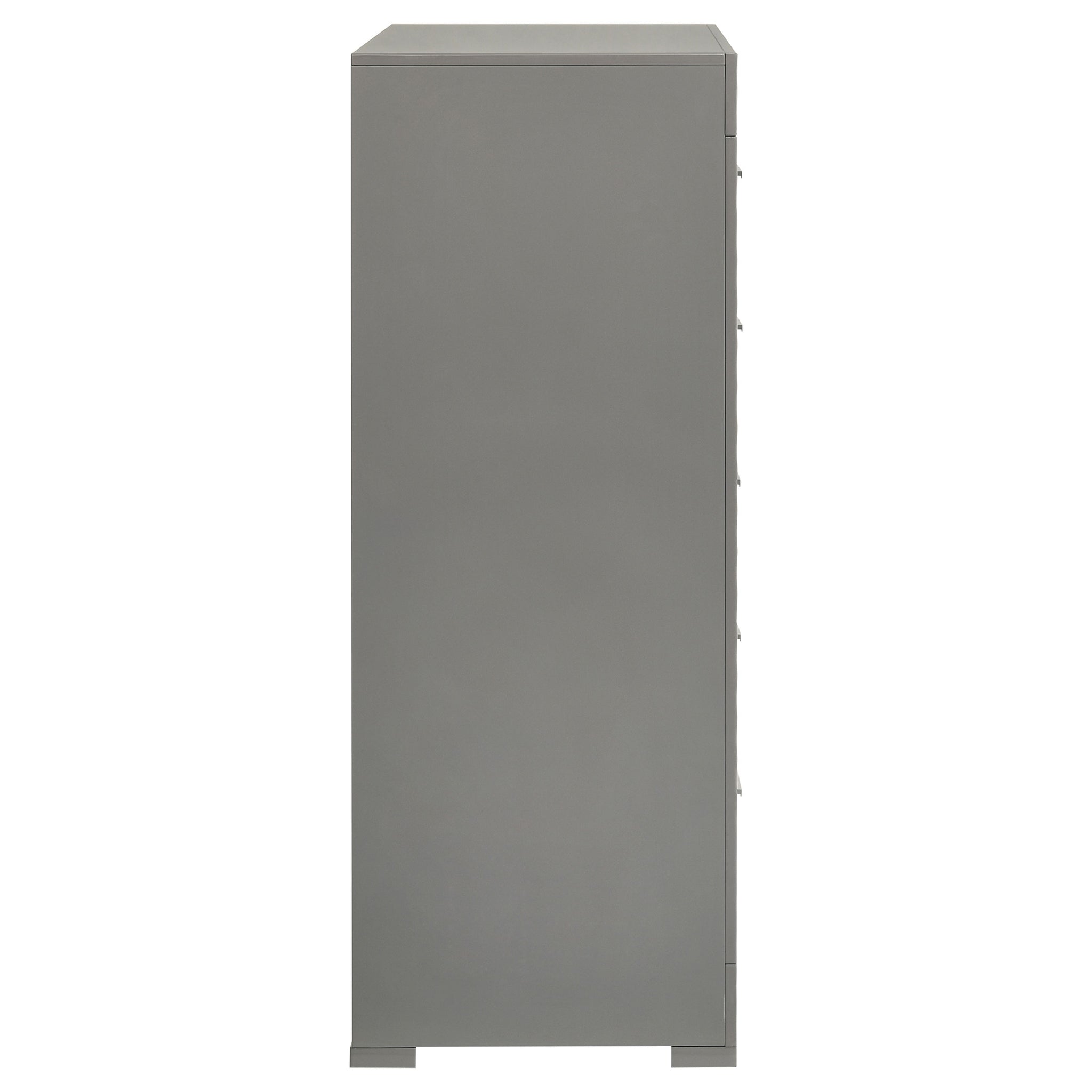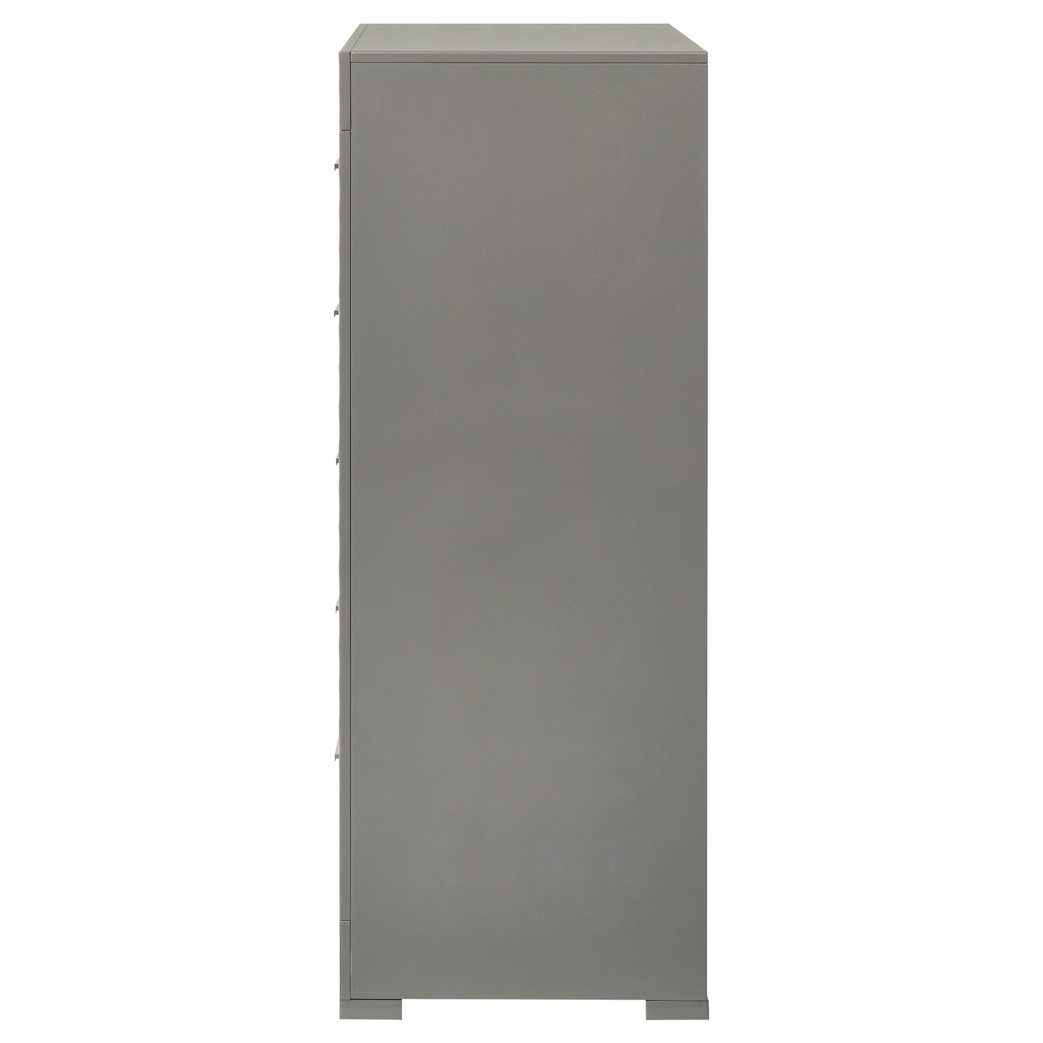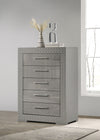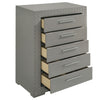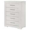 Organize your wardrobe in style with this contemporary chest. The high gloss finish and 3-dimensional diamond tile emboss provide a chic, modern look that enhances any bedroom decor. Five spacious drawers offer ample storage for clothing and linens, each with felt lining in the top drawers to protect your delicate items. The chest is built with robust materials and Pin construction joinery, ensuring durability and smooth functionality. This piece is both practical and stylish, perfect for a modern home. Key Features: • Contemporary chest with white high gloss finish • Five drawers with felt-lined top drawers for added protection • 3-dimensional diamond tile emboss adds texture and elegance • Pin construction joinery and metal glides ensure durability • Made from solid hardwood and engineered wood