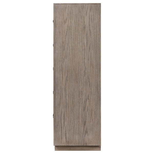 Chrome finish bar pulls add a touch of shine to the neutral barley brown finish of a modern five-drawer chest. Delivering ample storage with a compact footprint, the chest features a streamlined silhouette with mitered trim that creates a sense of depth. The top provides an easy spot for decor or a jewelry box that brings a personal touch. The soft wood grain finish of the chest complements in a variety of bedroom settings, making this a versatile choice for your home. The look is complete with a recessed base that provides a touch of height and airy presence. Key Features: • Augment your bedroom with the easy, stylish storage featured in this modern five-drawer chest • Barley brown finish is soft and neutral, offering a fresh palette for the decor of your choice • Five drawers of equal size provide ample storage for clothing, accessories and linens • Mitered trim adds dimension while chrome finish bar pulls complete the look • Recessed base lightens the look while a wide top with a framed mirror is ideal for personal decor