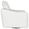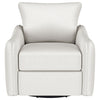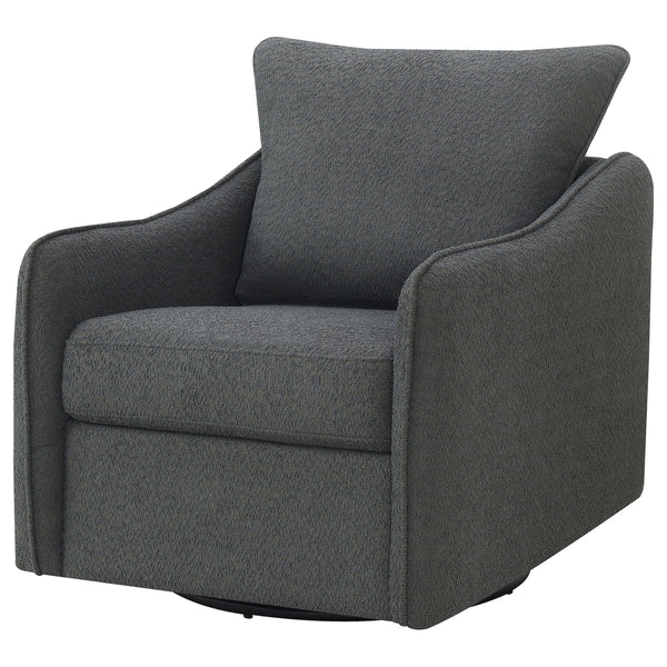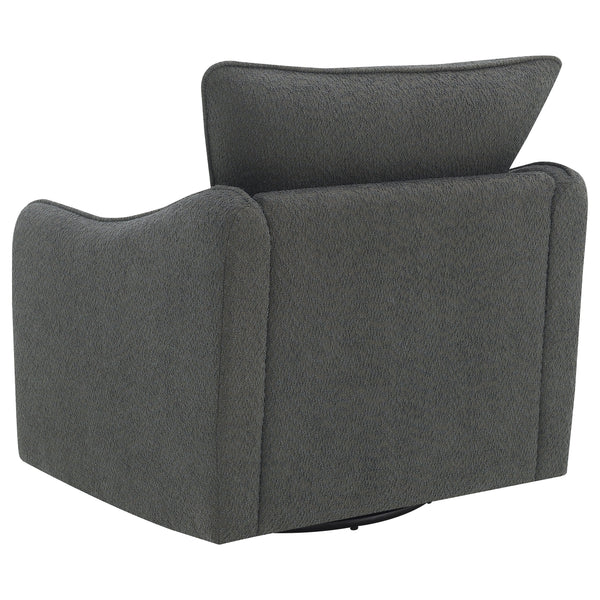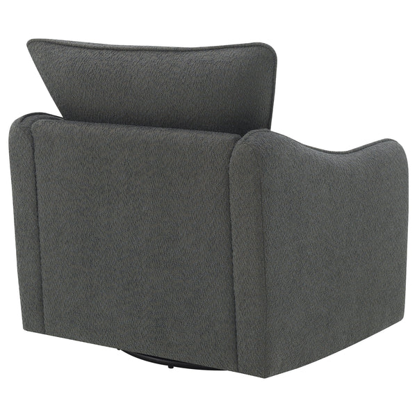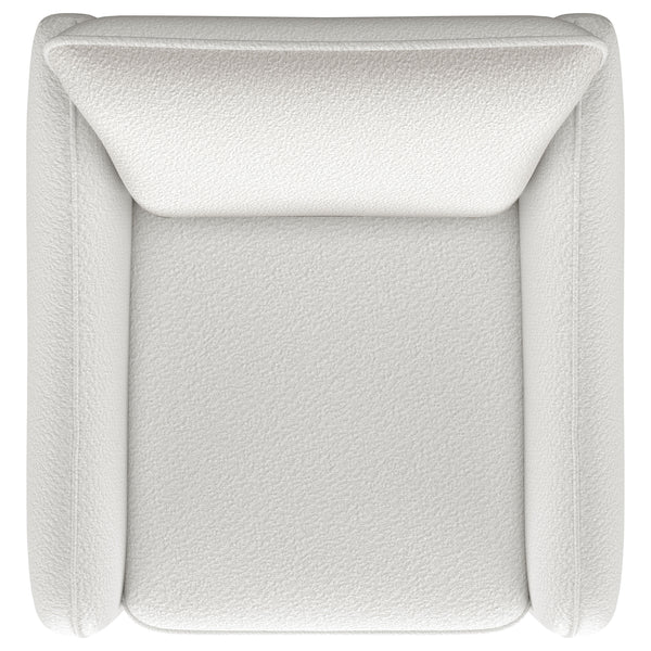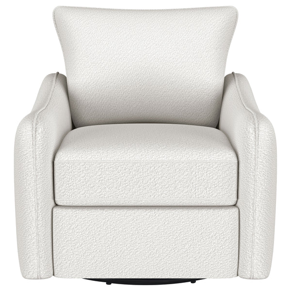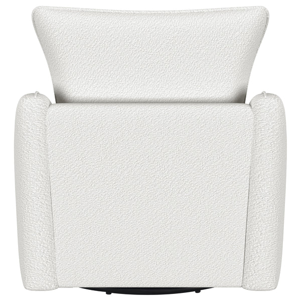 Nestled within the soft embrace of this bouclé upholstered chair, one finds a moment of tranquility. Its harmonious 360 swivel and glider functionality make each movement a fluid dance, a gentle invitation to unwind. The meticulously shaped arms, a testament to refined style, offer a restful perch for weary elbows. As the day's light fades, this chair becomes a cherished haven, its silhouette a blend of comfort and contemporary charm. In this cozy nook, time slows, and serenity takes a seat. Key Features: • Chair upholstered in soft, textured bouclé fabric for a luxurious feel • Features a 360-degree swivel and glider mechanism for smooth movement • Contemporary arm shape and style providing elegant aesthetics and comfort • Solid construction ensures durability and support • Versatile design complements both modern and traditional decors